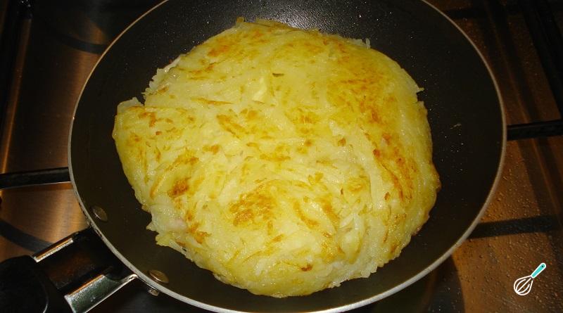 Pressione para tornar a batata rosti compacta, e fique atento à fritura: quando deixar de observar azeite, adicione mais um pouco pelas beiradas. Passados 10 minutos, ou quando as laterais da batata rosti se apresentam douradas, vire pra fritar do outro lado também.