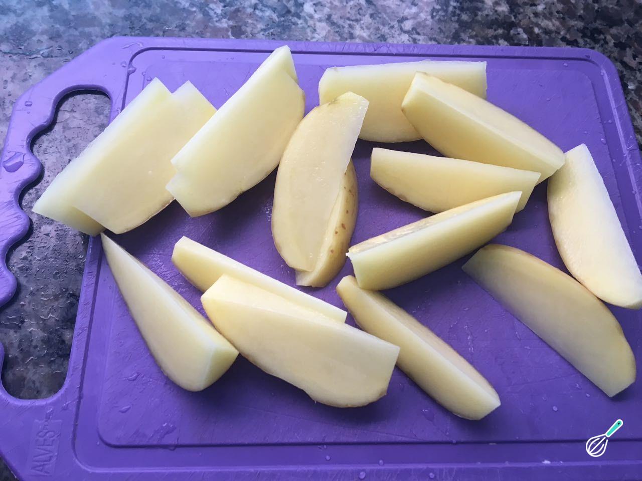 Lave bem as batatas e corte em fatias sem descascar, porque esta é uma receita de batata rústica.