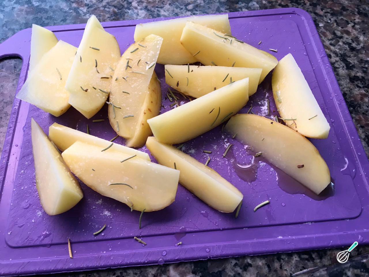 Em seguida misture as batatas com os temperos: a azeite, o sal e o alecrim.