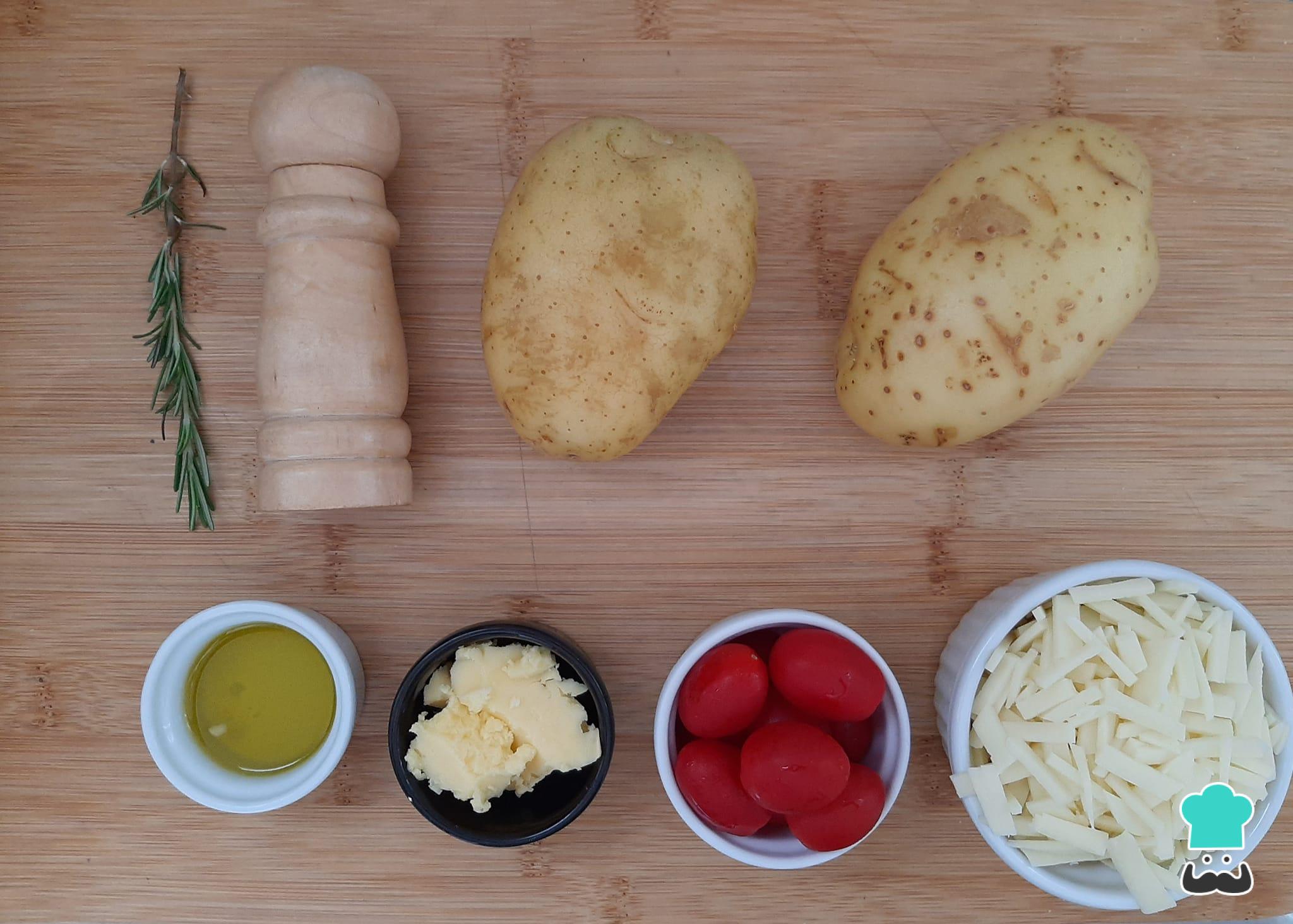 Separe os ingredientes necessários para preparar a batata salteada com tomate e mussarela.