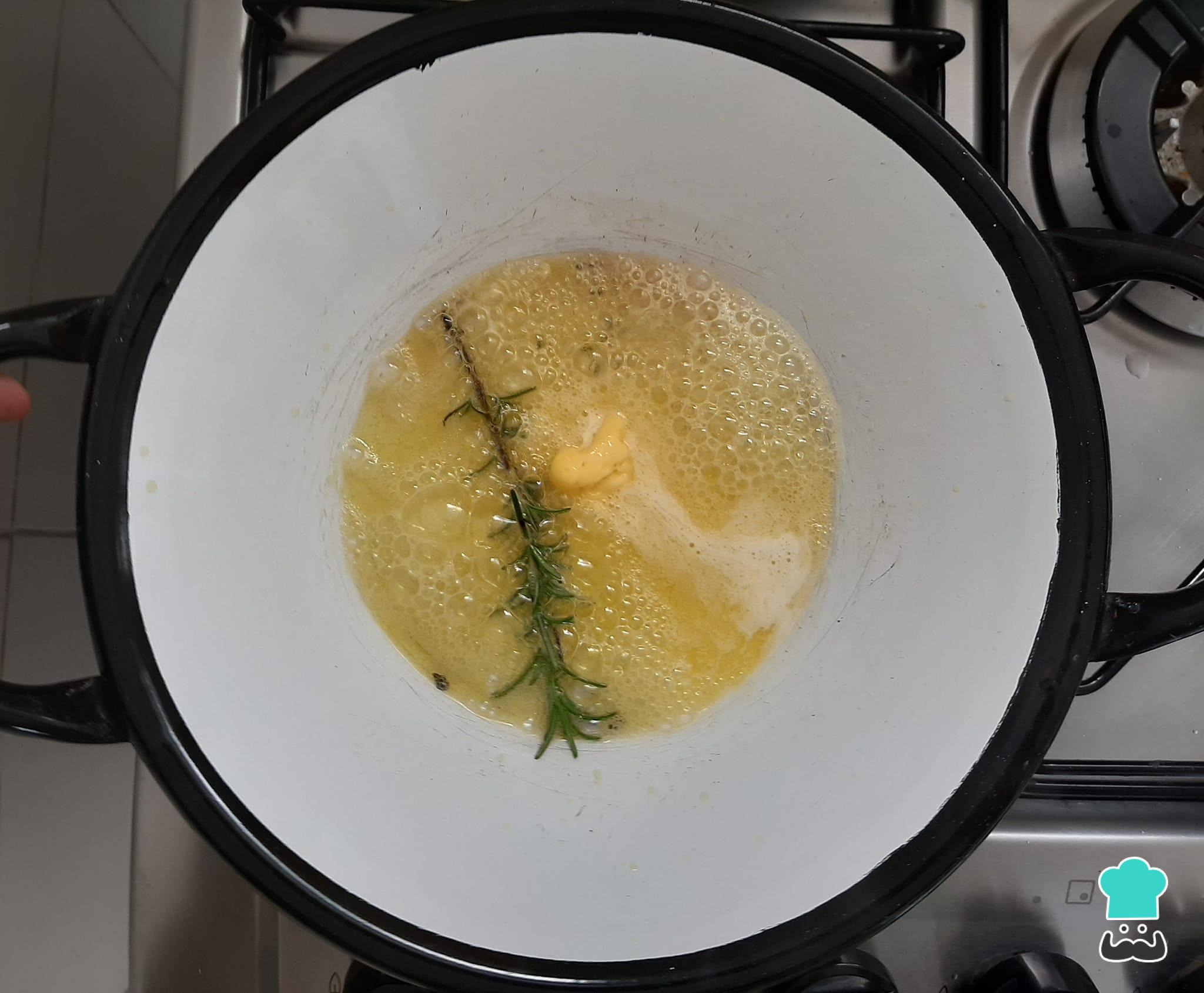 Numa frigideira média, em fogo moderado aqueça o azeite de oliva e em seguida adicione a manteiga, deixando-a derreter.