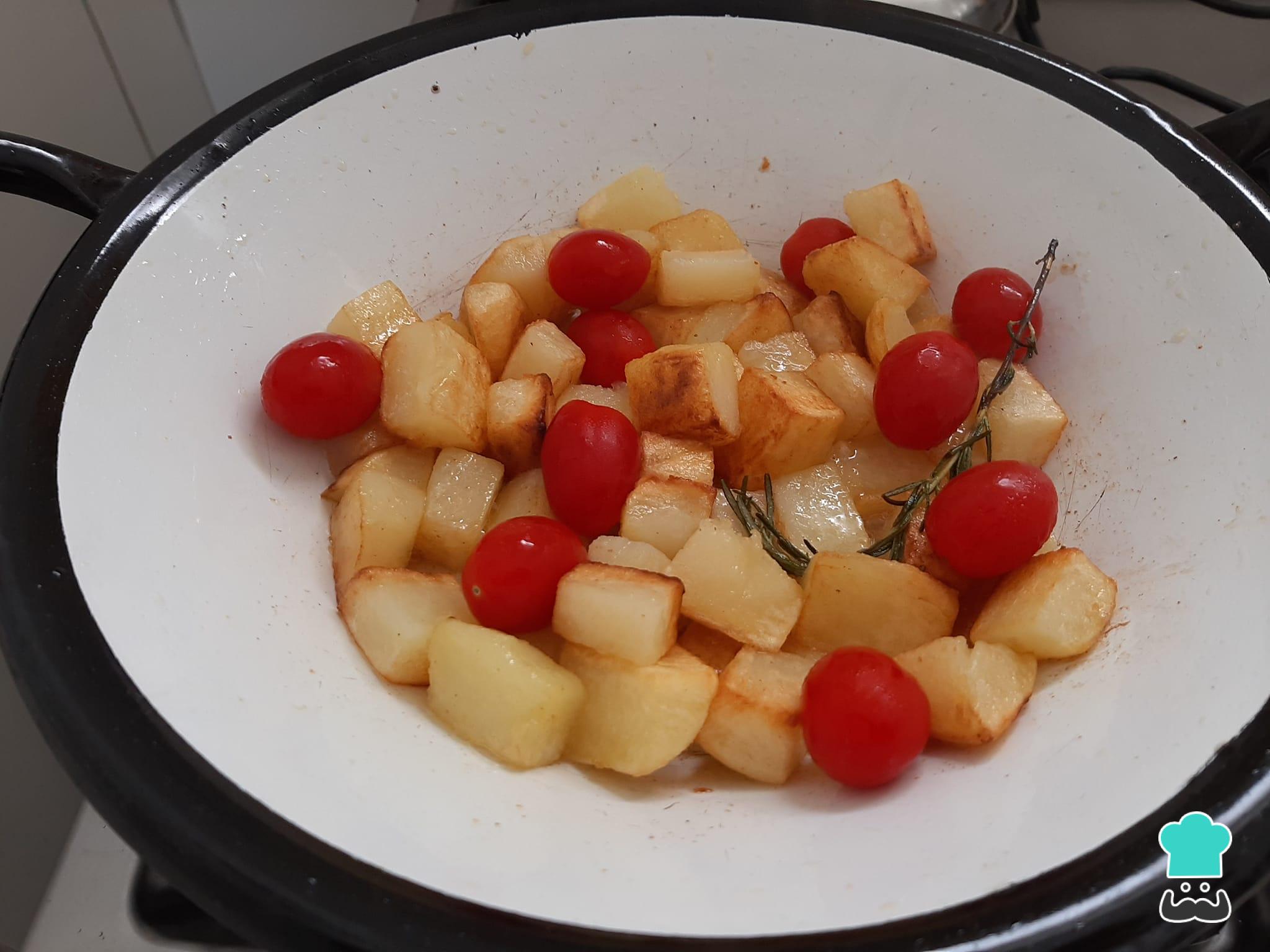 Dica: Os tomatinhos irão soltar o suco e deixarão as batatas com um gosto incrível, portanto não deixe de inclui-los!