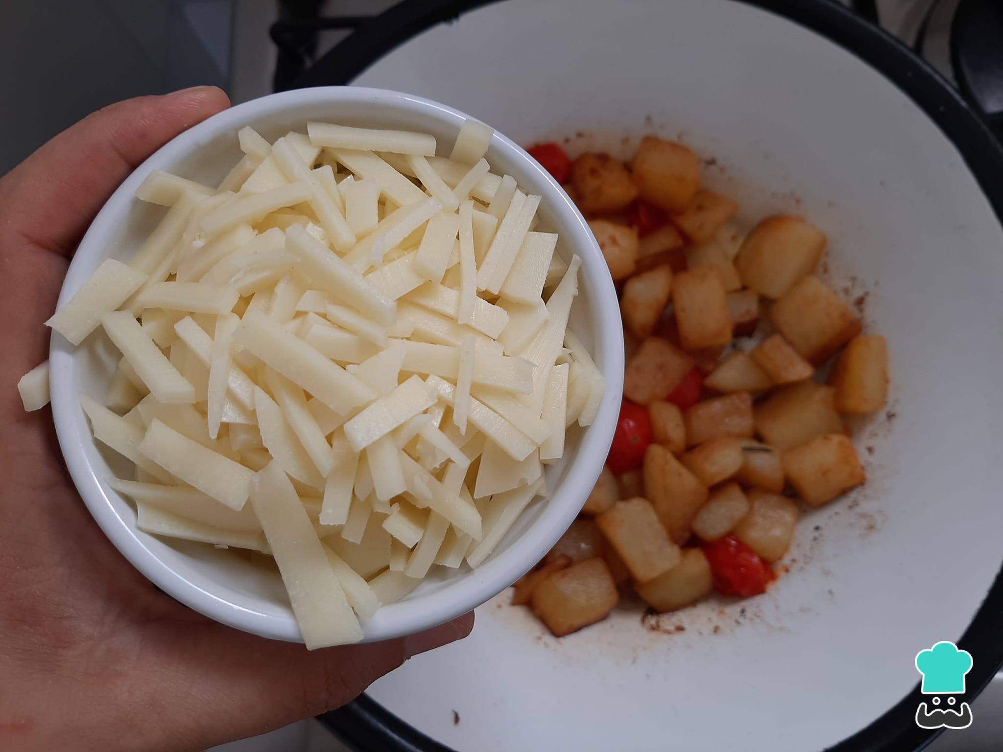 Reduza o fogo e adicione o queijo mussarela por cima das batatas.