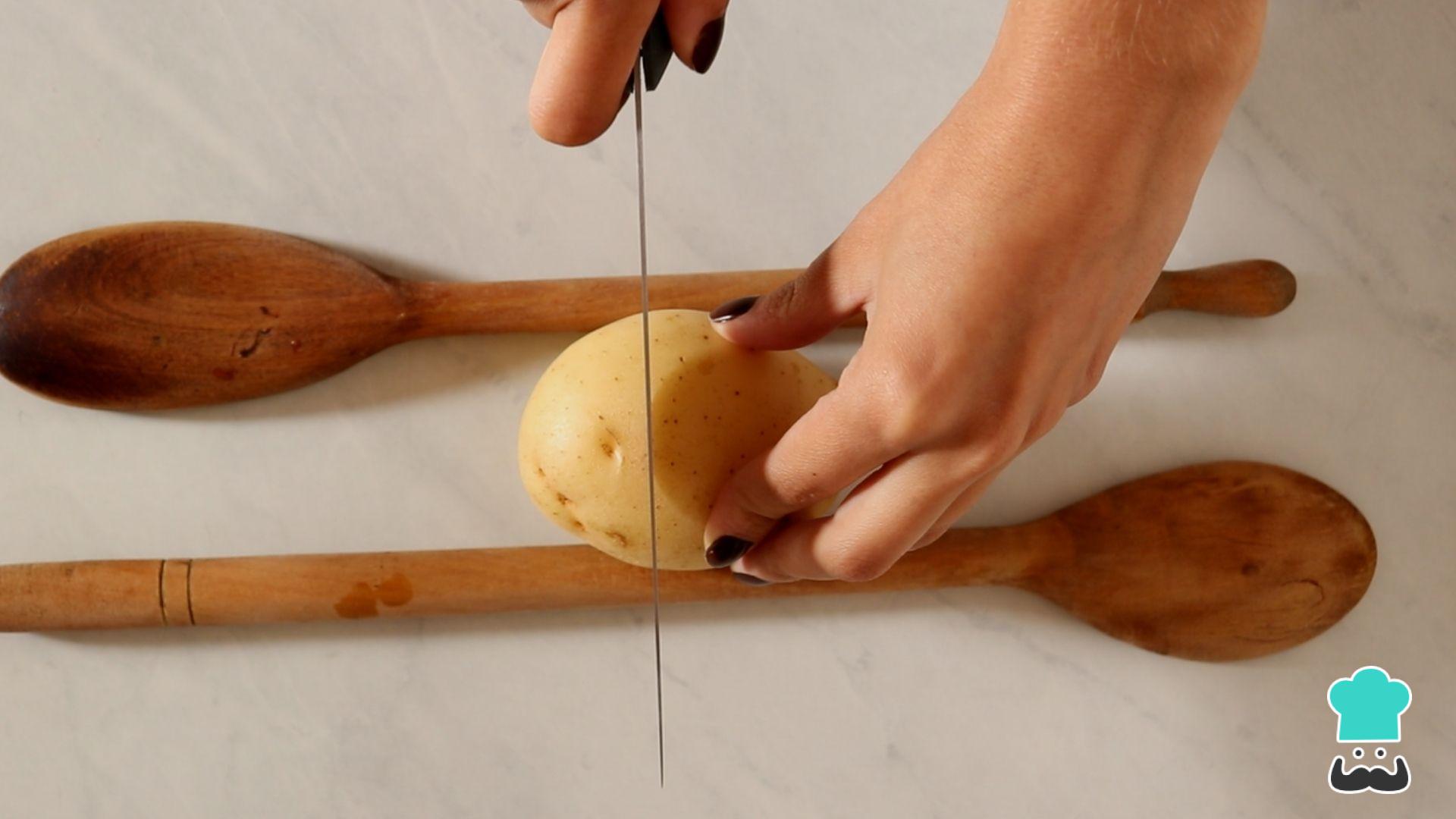 E aqui vai uma dica para você fazer o corte certinho da batata sanfonada: coloque duas colheres de pau paralelas viradas para baixo e coloque a batata no meio. Corte fatias, mas sem chegar na base da batata - é aqui que essa "gambiarra" com a colher de pau vai te ajudar, evitando que você corte a batata até o fim!