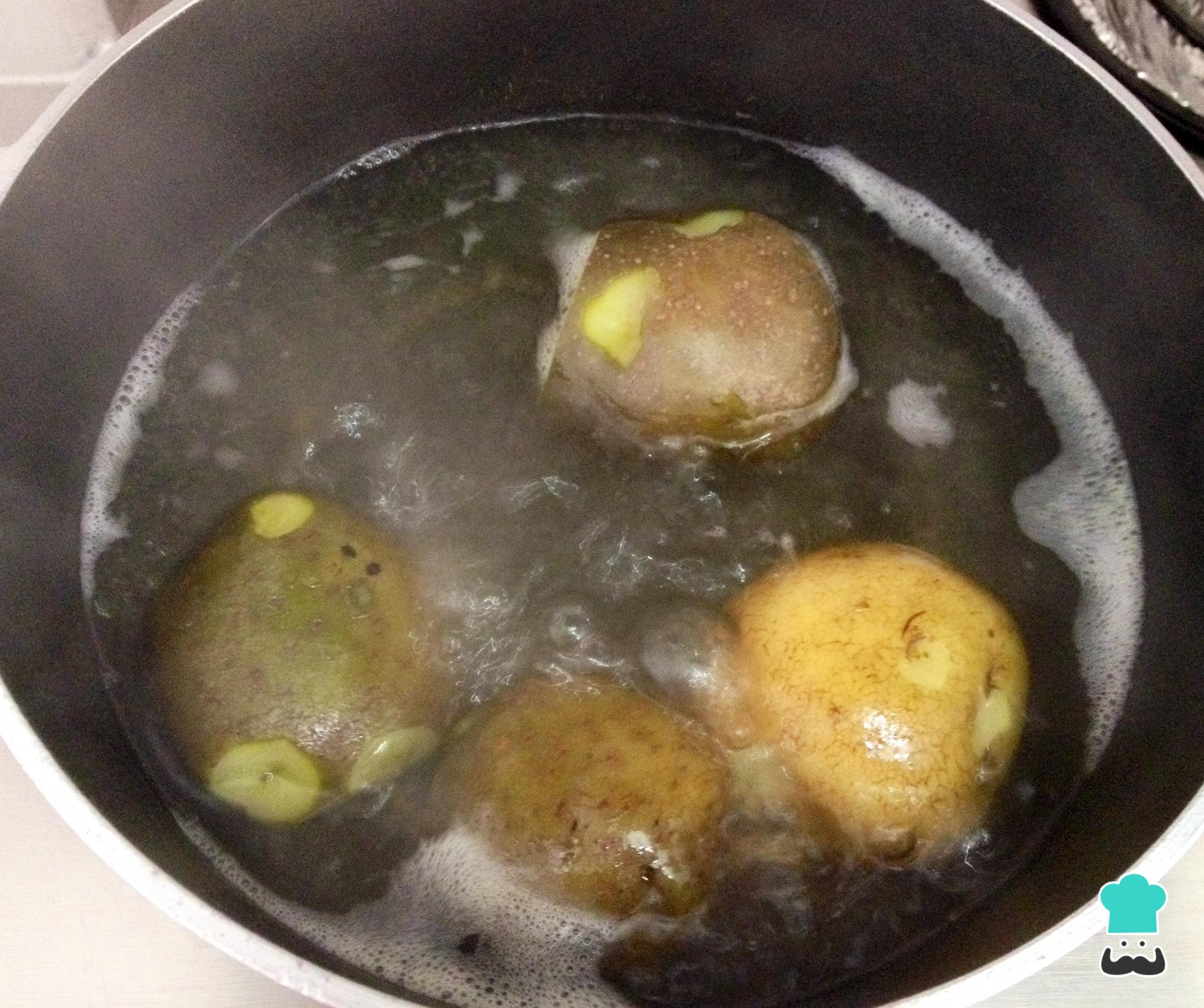 Limpe muito bem as batatas sem retirar a casca e leve ao fogo médio numa panela com água e sal. Deixe por 10 minutos, somente para deixar ela levemente macia, e retire. Se quiser descasque, corte em 4 partes e cada parte em duas metades.