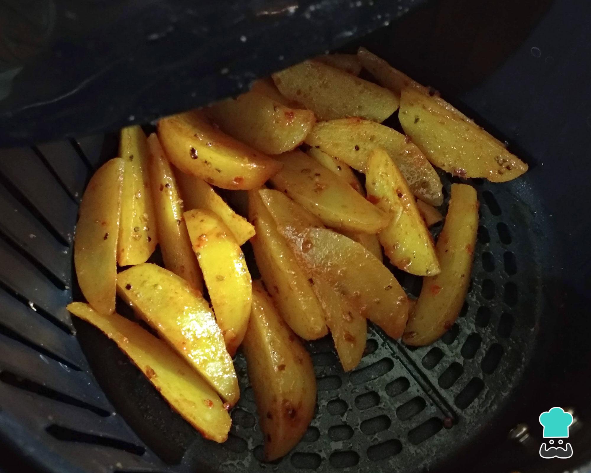 Coloque uma porção para assar na AirFryer a 180ºC por 10-15 minutos ou até conseguir batatas coradas e com casquinha crocante. Retire para um prato e repita com outra porção de batatas.