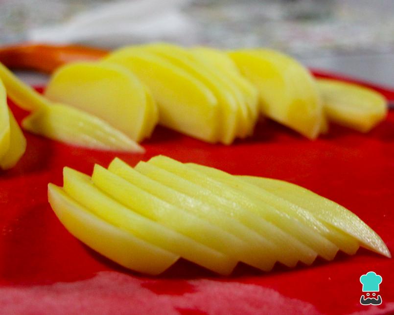 Para começar essa receita de batata suíça você deve cortar as batatas em fatias finas e levá-las para cozinhar numa panela com água e uma pitada de sal.