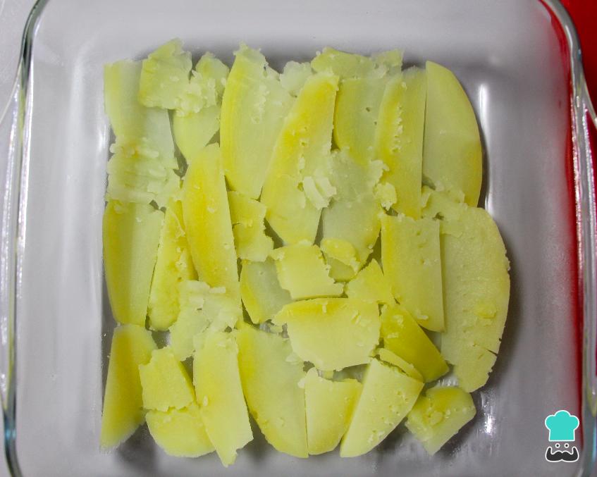 Em outro recipiente (que possa ir no forno) coloque uma camada de batata.