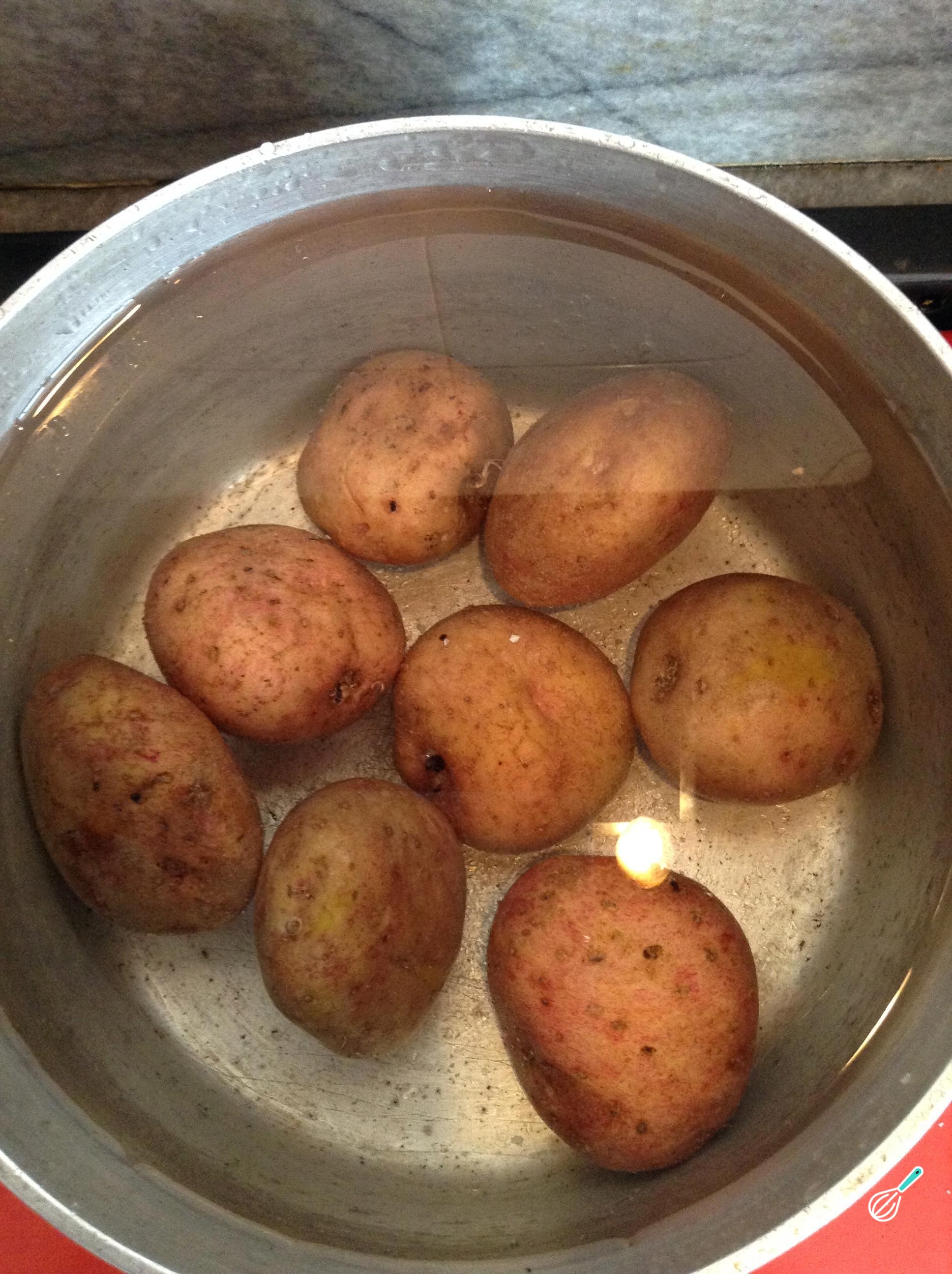 Lave as batatas e coloque-as em uma panela funda, encha com água até cobrir e adicione uma colher de sopa de sal a gosto. Cozinhe as batatas até que estejam macias. Retire do fogo e reserve.