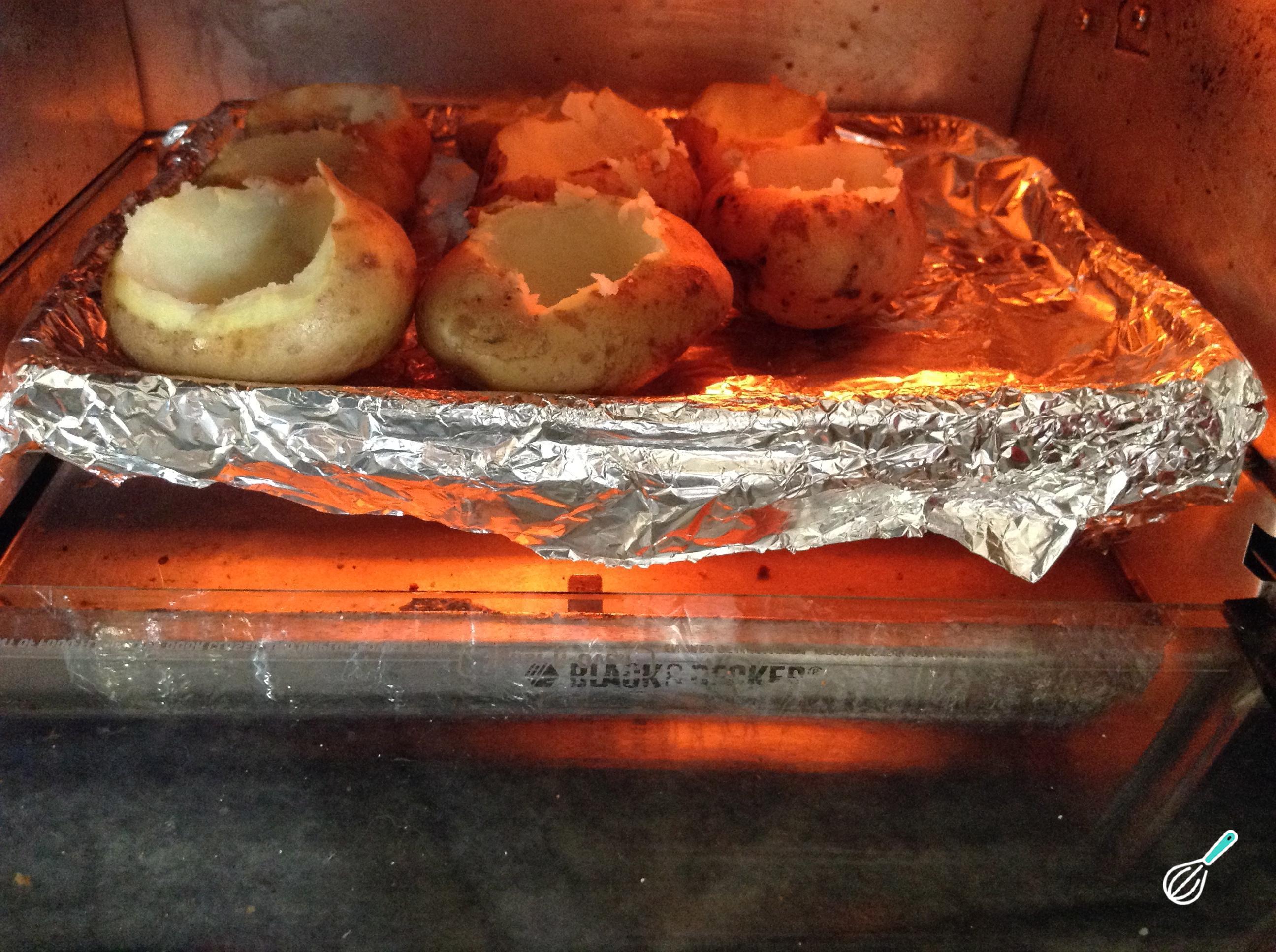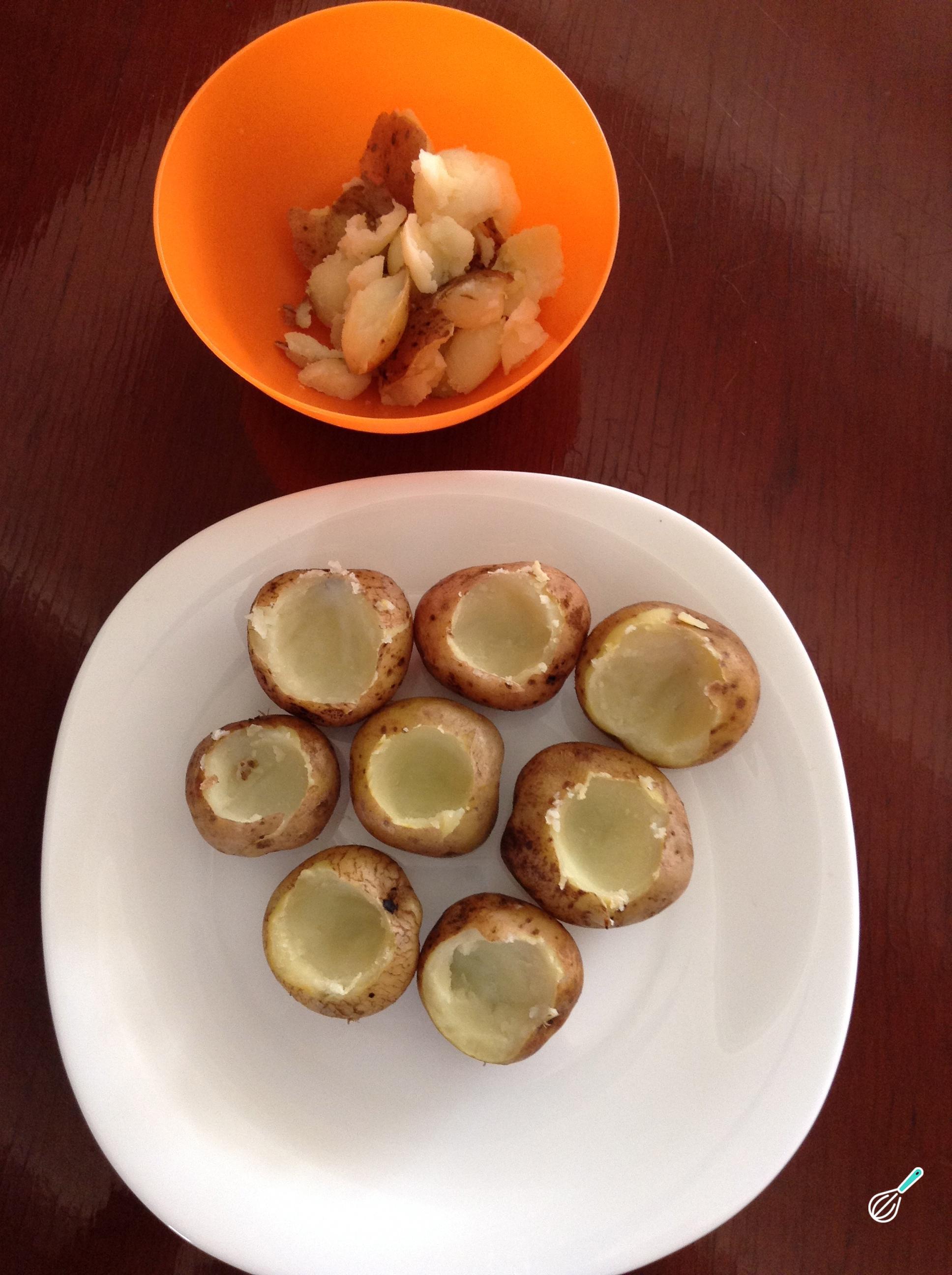 Assim que estiverem mornas, com uma colher de chá, retire um pouco do centro de batata e reserve esse recheio. Realize este procedimento com todas as batatas.
