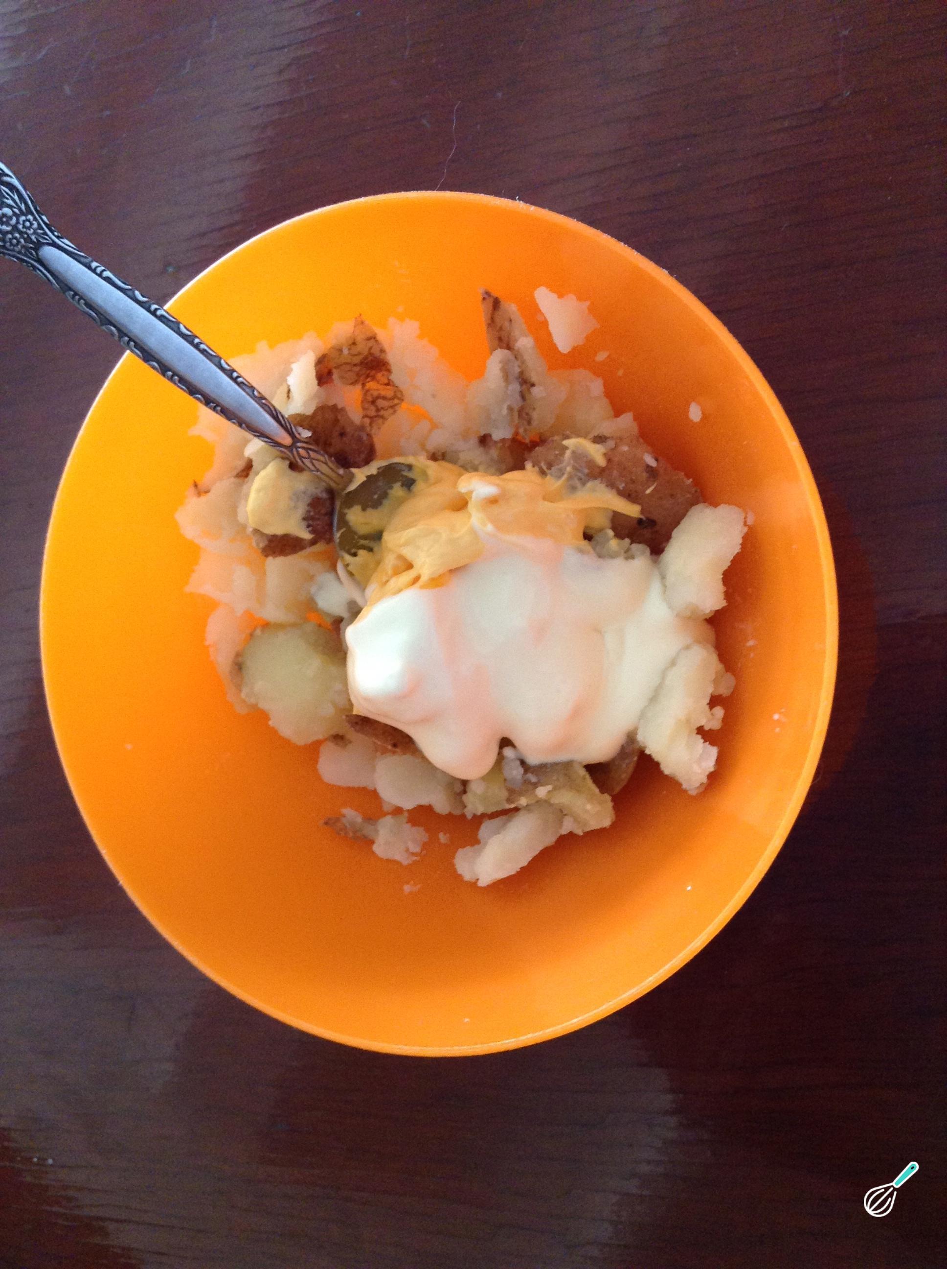 Em uma taça ou tigela onde temos que o recheio de batata que reservamos, misture com o queijo cheddar e o creme de leite. Mexa bem.