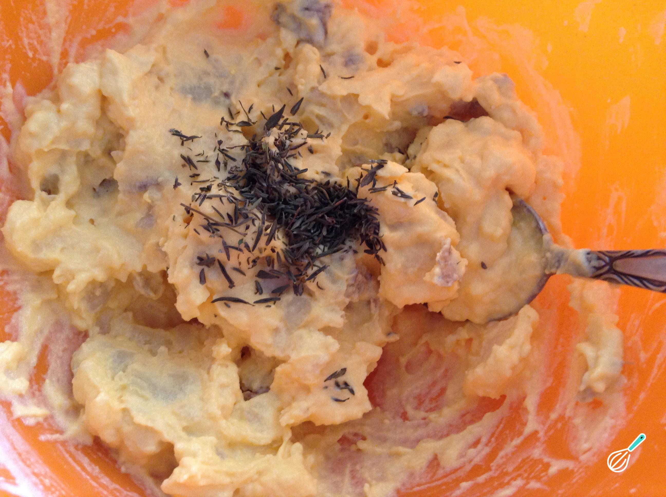 Adicione a manteiga ou margarina, o tomilho seco, sal e pimenta do reino. Misture bem até que todos os ingredientes estejam incorporados.