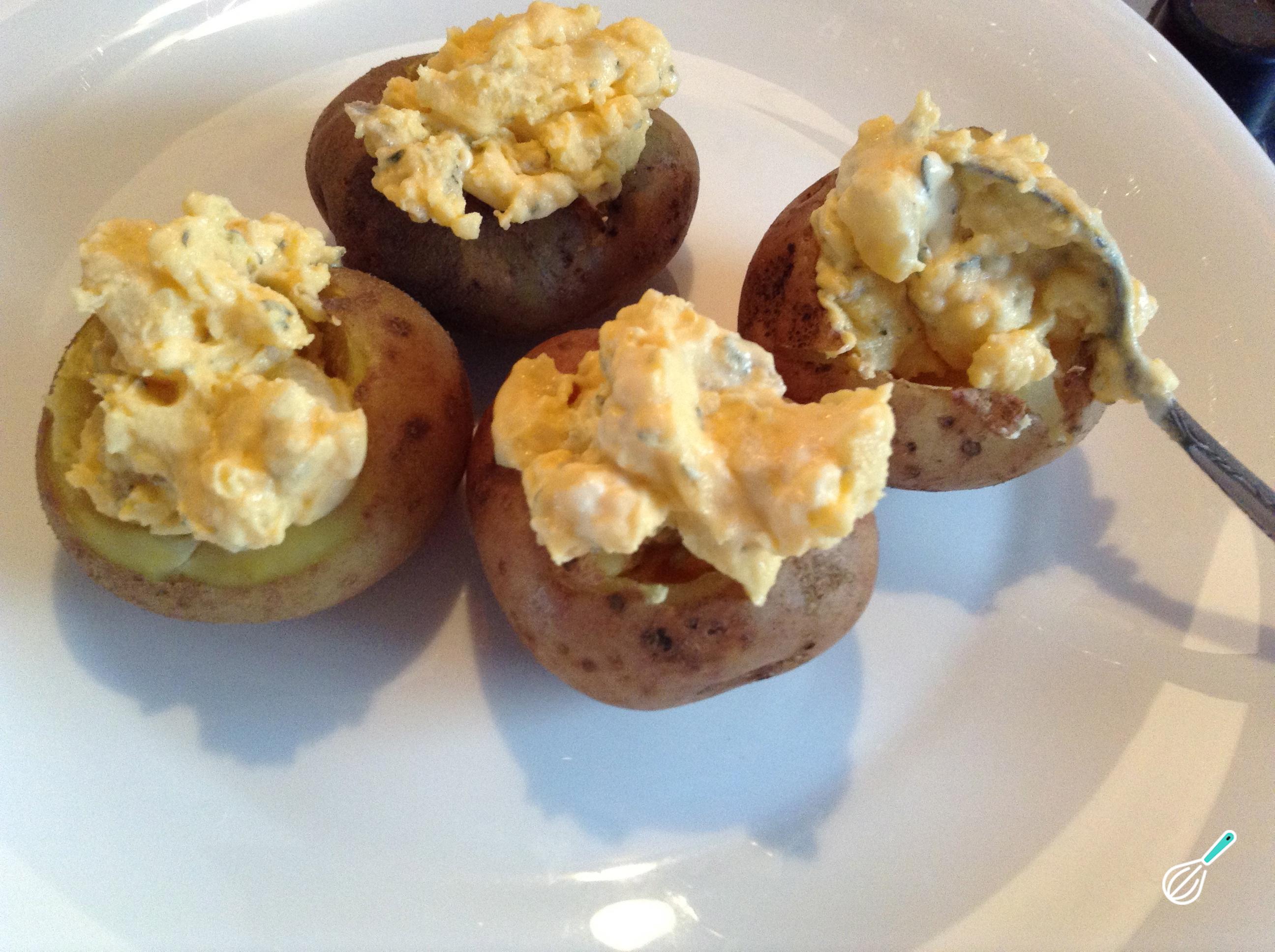 Com uma colher de chá encha cada uma das batatas com o recheio.