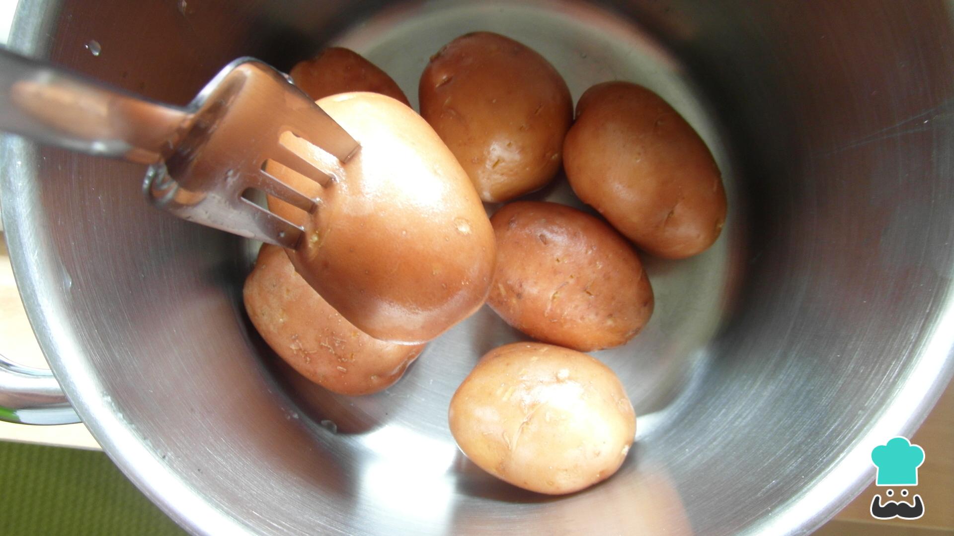 Para fazer esta receita de batata ao murro no forno comece por lavar muito bem as batatas, já que elas são cozinhadas com a pele. Pique-as com um garfo, para acelerar o cozimento, e coloque em uma panela.