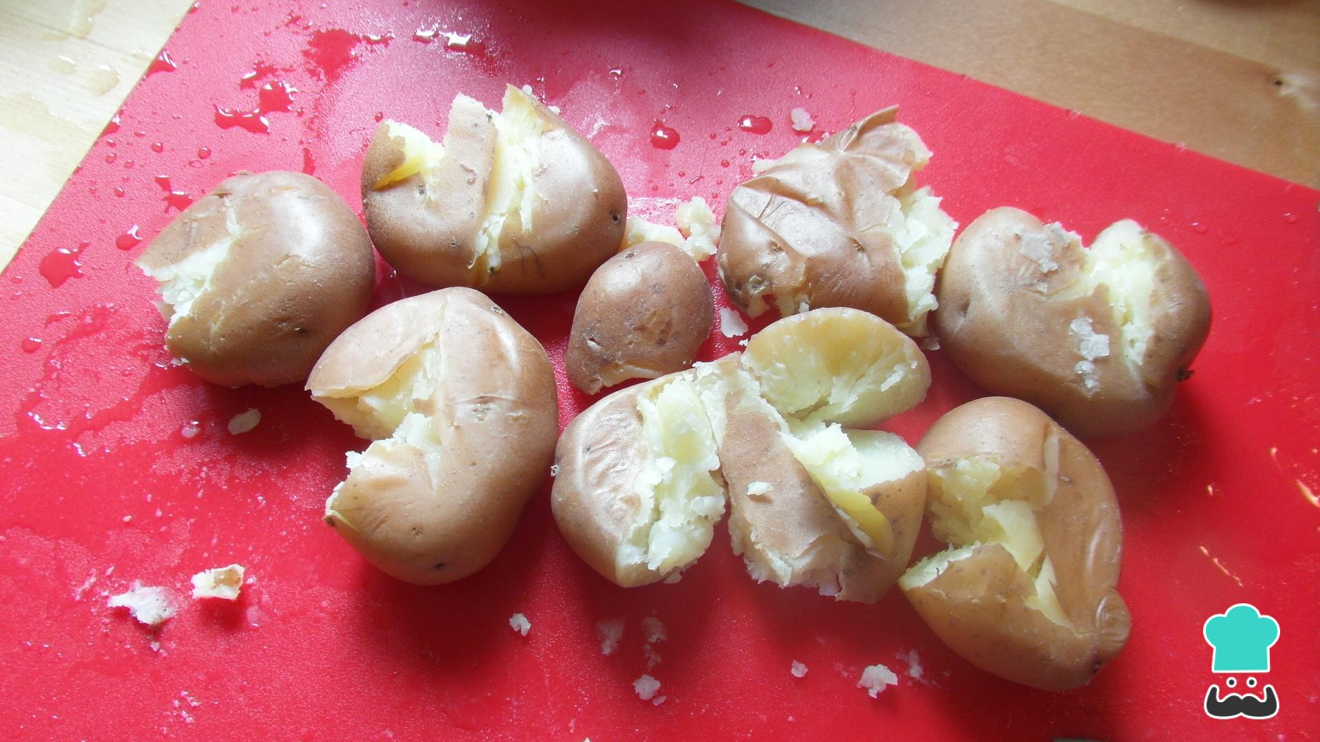 Após o passo anterior, coloque as batatas em uma tábua de cozinha e esmague-as com uma colher ou com um martelo de cozinha.