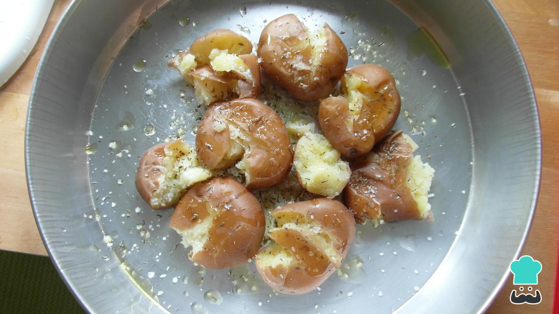 Coloque as batatas ao murro num tabuleiro de forno untado com azeite e tempere-as com sal grosso e tomilho ou oréganos. Regue com azeite de oliva abundante, para que não sequem.