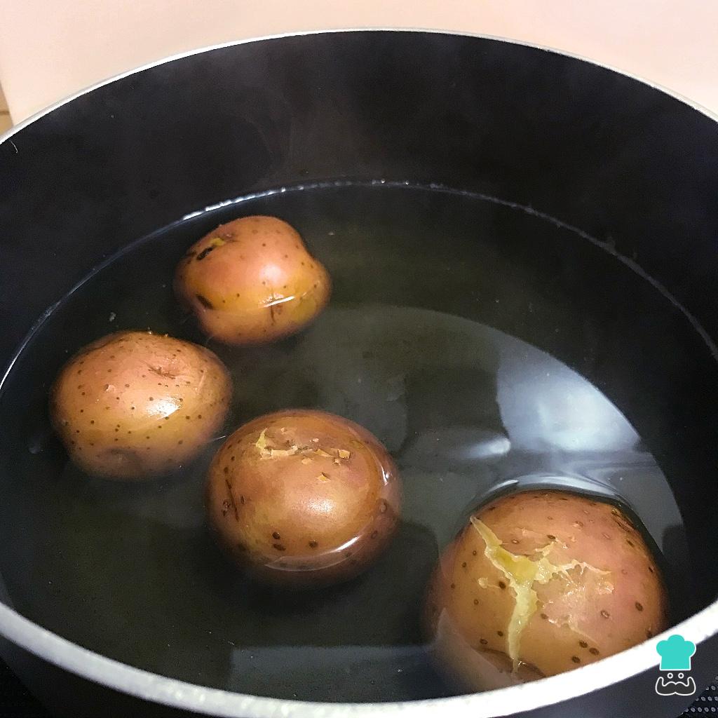 Cozinhe as batatas em água com sal, sem retirar a casca, até estejam macias.