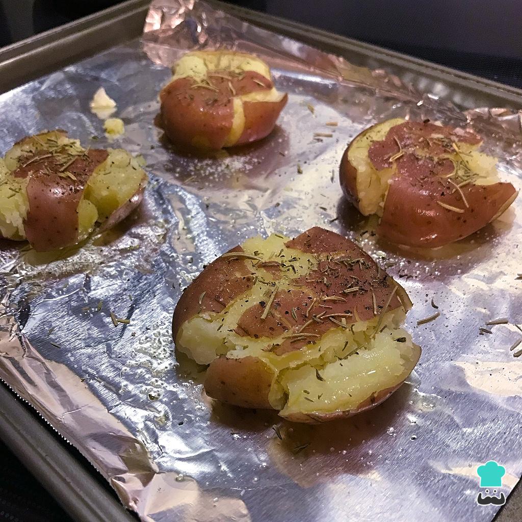 Cubra uma forma com papel alumínio e amasse as batatas com a ajuda de um prato ou copo (mais fácil do que com a mão, mas fique à vontade para dar um murro nelas).