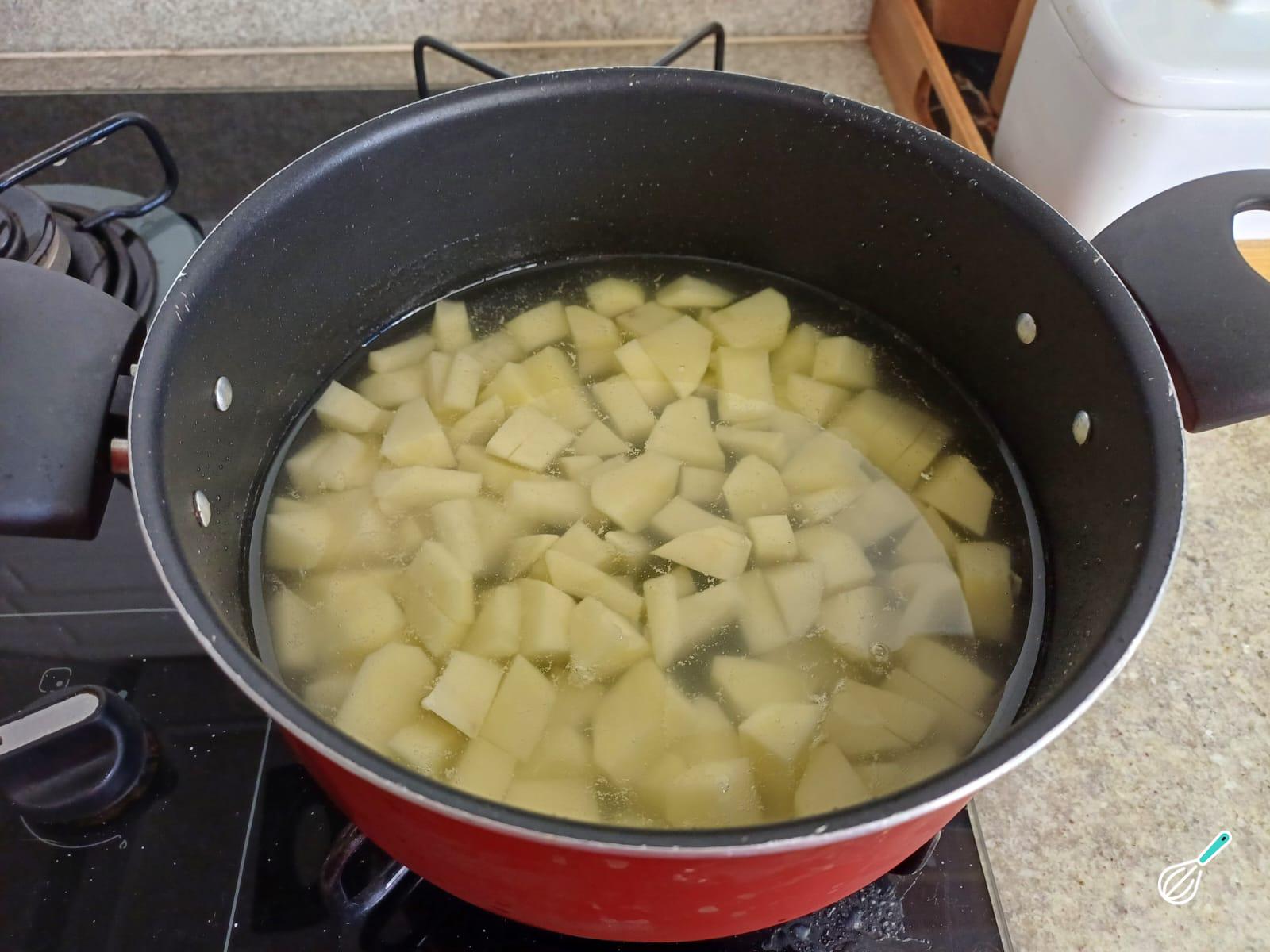 Descasque e corte as batatas em cubos médios. Coloque em uma panela e cubra com água e sal e leve ao fogo para cozinhar em fogo médio, até ficarem macias, mas ainda firmes. Escorra e deixe esfriar.