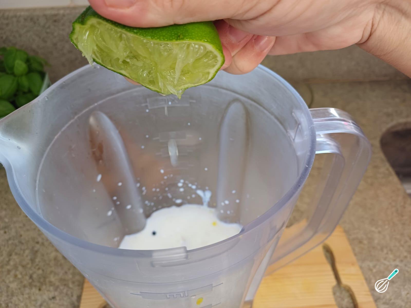 No copo do liquidificador ou mixer, coloque o leite e bata juntamente com o óleo, aos poucos até ficar cremoso.
