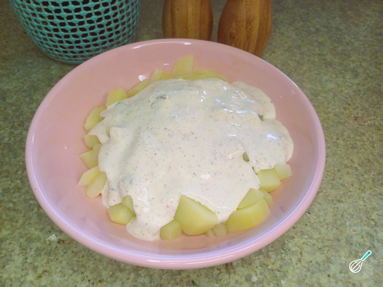 Disponha a batata cozida e fria em uma travessa bonita, espalhe o molho de maionese caseira, misture delicadamente para não desmanchá-las.