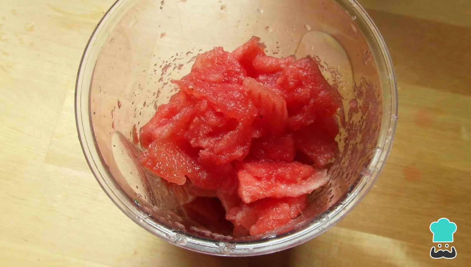 Corte a melancia em pedaços. Se quiser pode retirar as sementes, porém estas são ricas em zinco e vitamina E. Bata a melancia no liquidificador ou com um mixer.