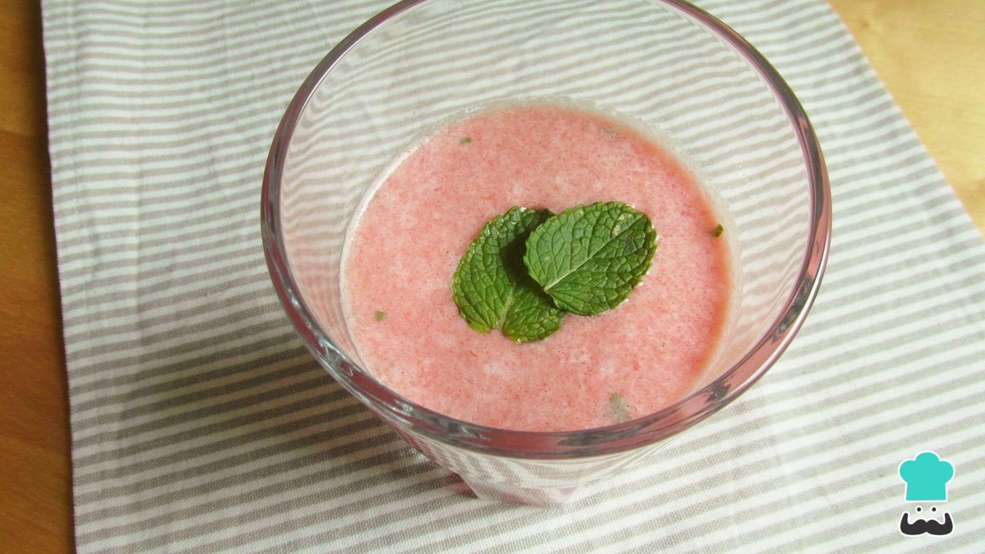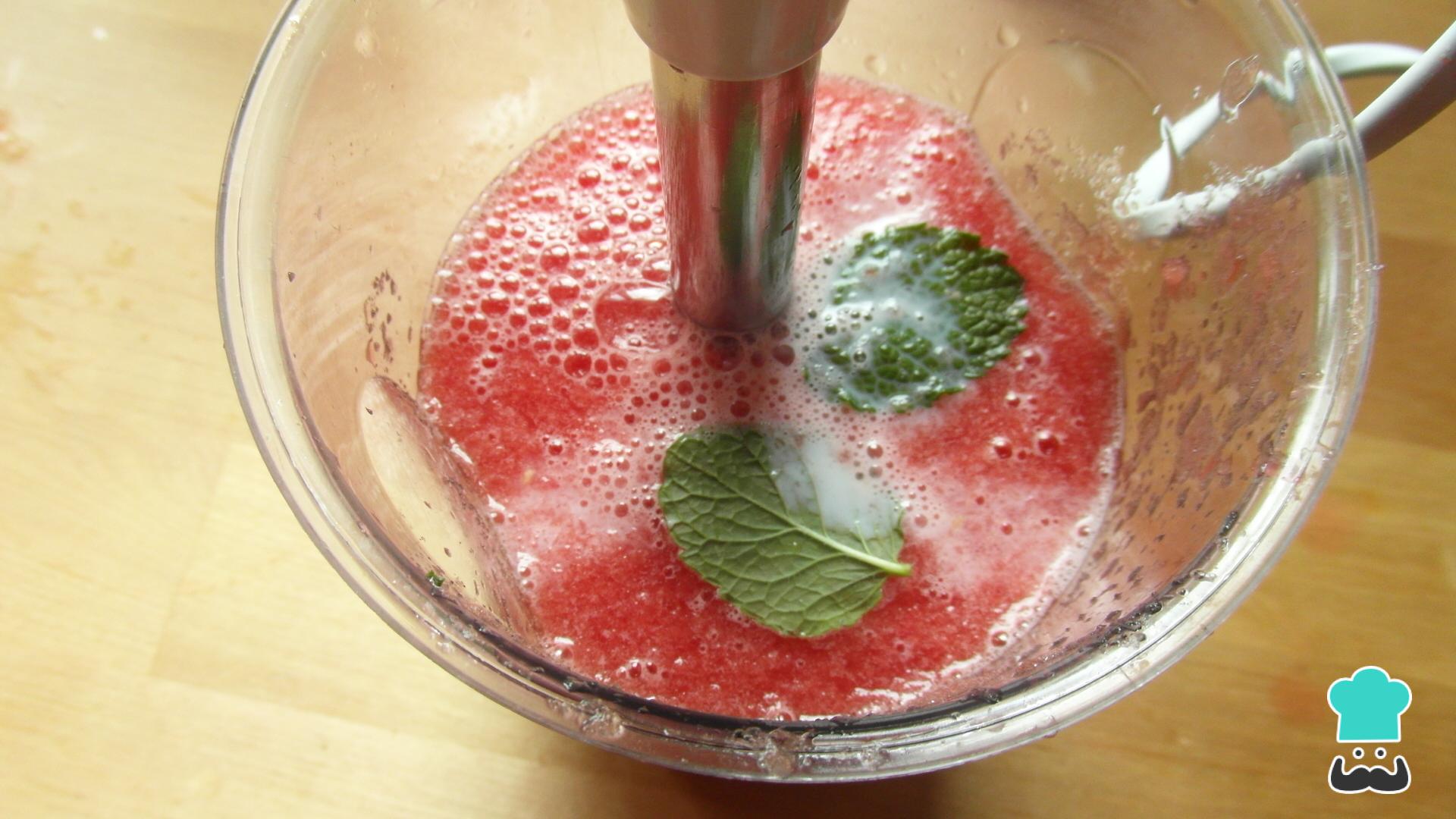 Acrescente as folhas de hortelã, que combinam muito bem com esta fruta refrescante, e acrescente leite a gosto, até obter a consistência que mais lhe agrada.