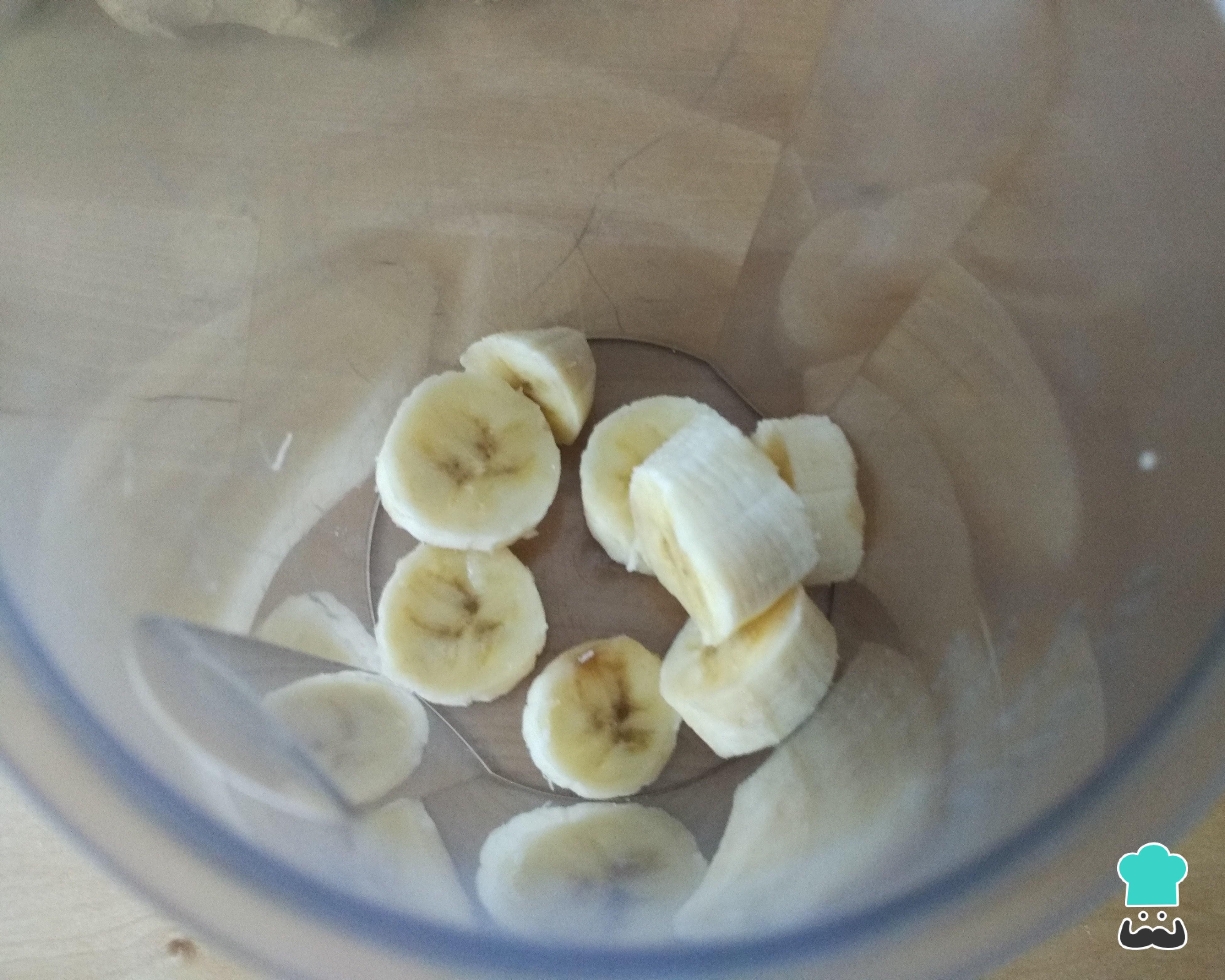 Descasque as bananas, corte em rodelas e coloque no copo do liquidificador ou do mixer de mão.