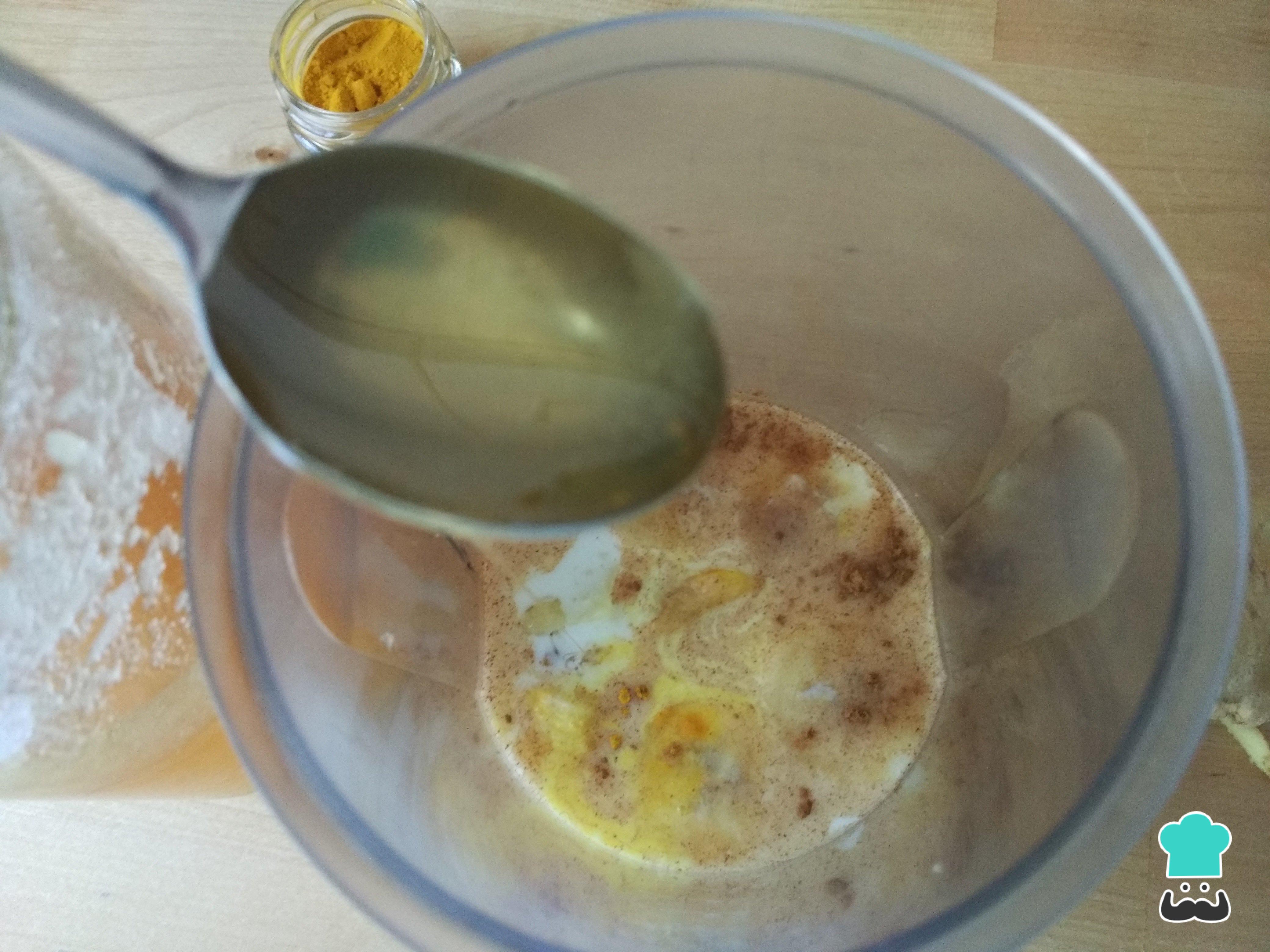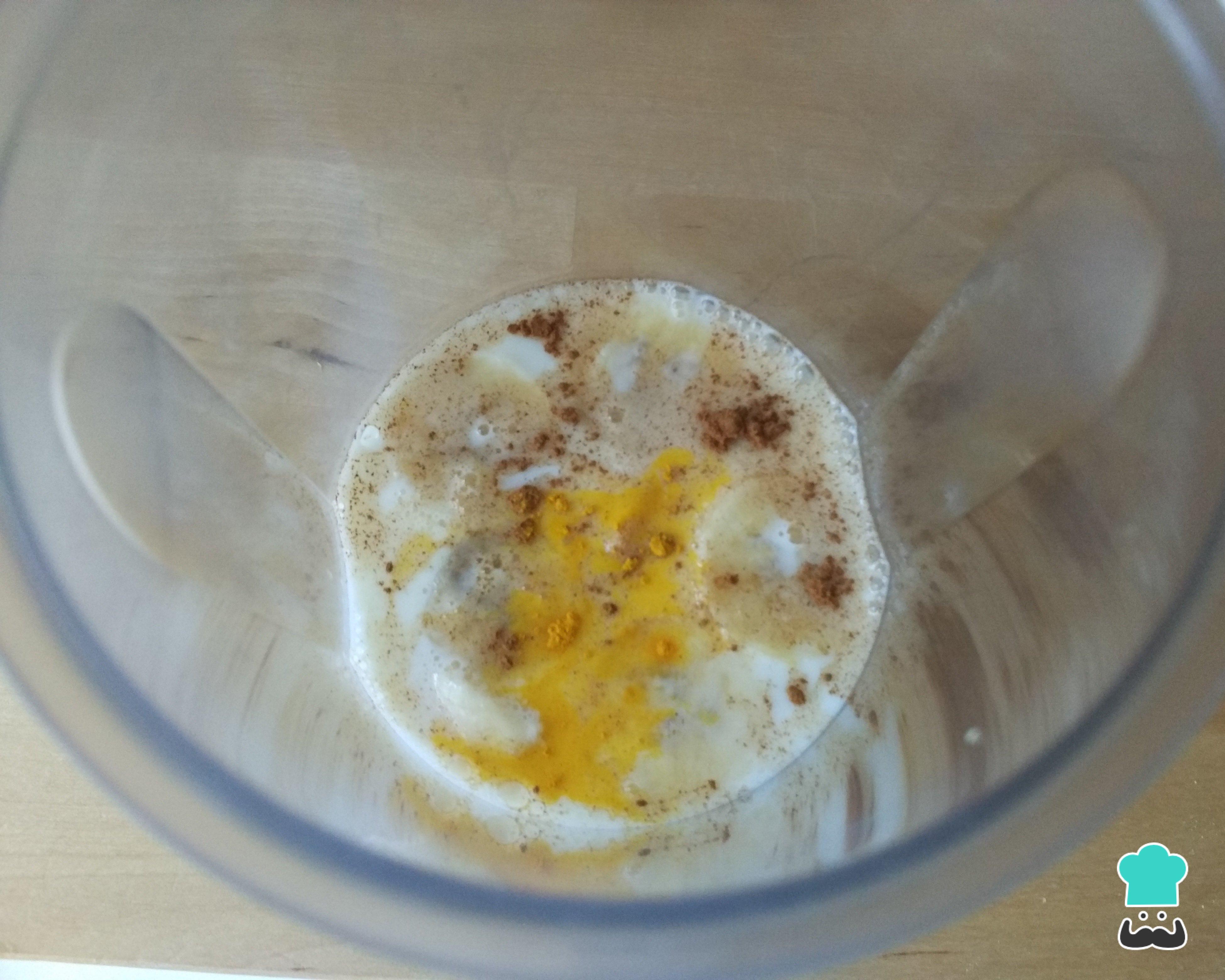 Acrescente o leite, a cúrcuma e a canela. Aconselhamos usar somente meia colher de chá de cúrcuma/açafrão da terra porque seu sabor é intenso, porém você pode colocar um pouco mais se preferir.