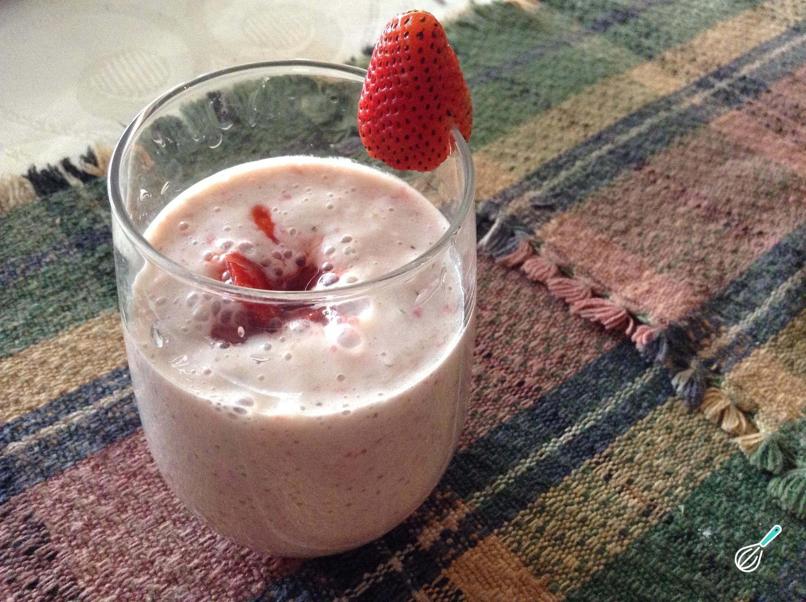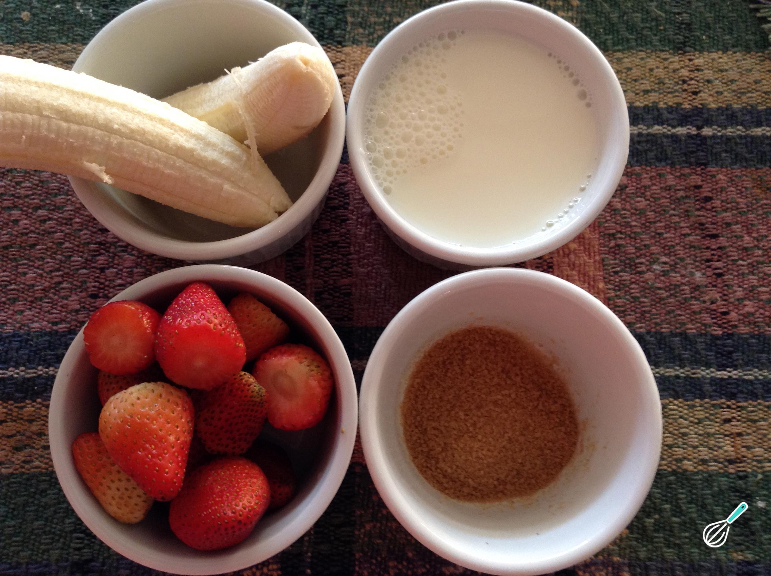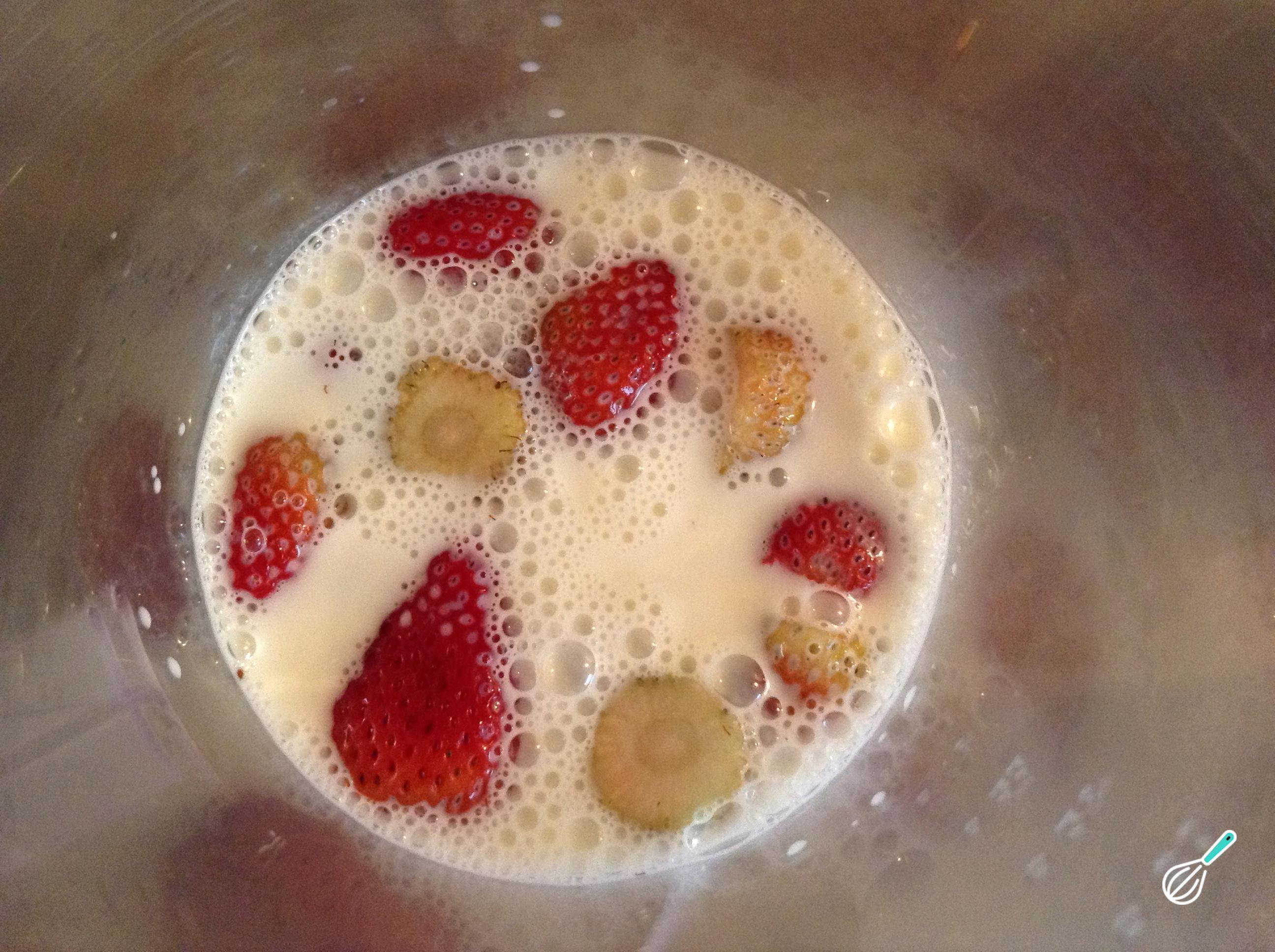 Coloque no copo do liquidificador o leite e os morangos. Bata até obter uma consistência de batido.