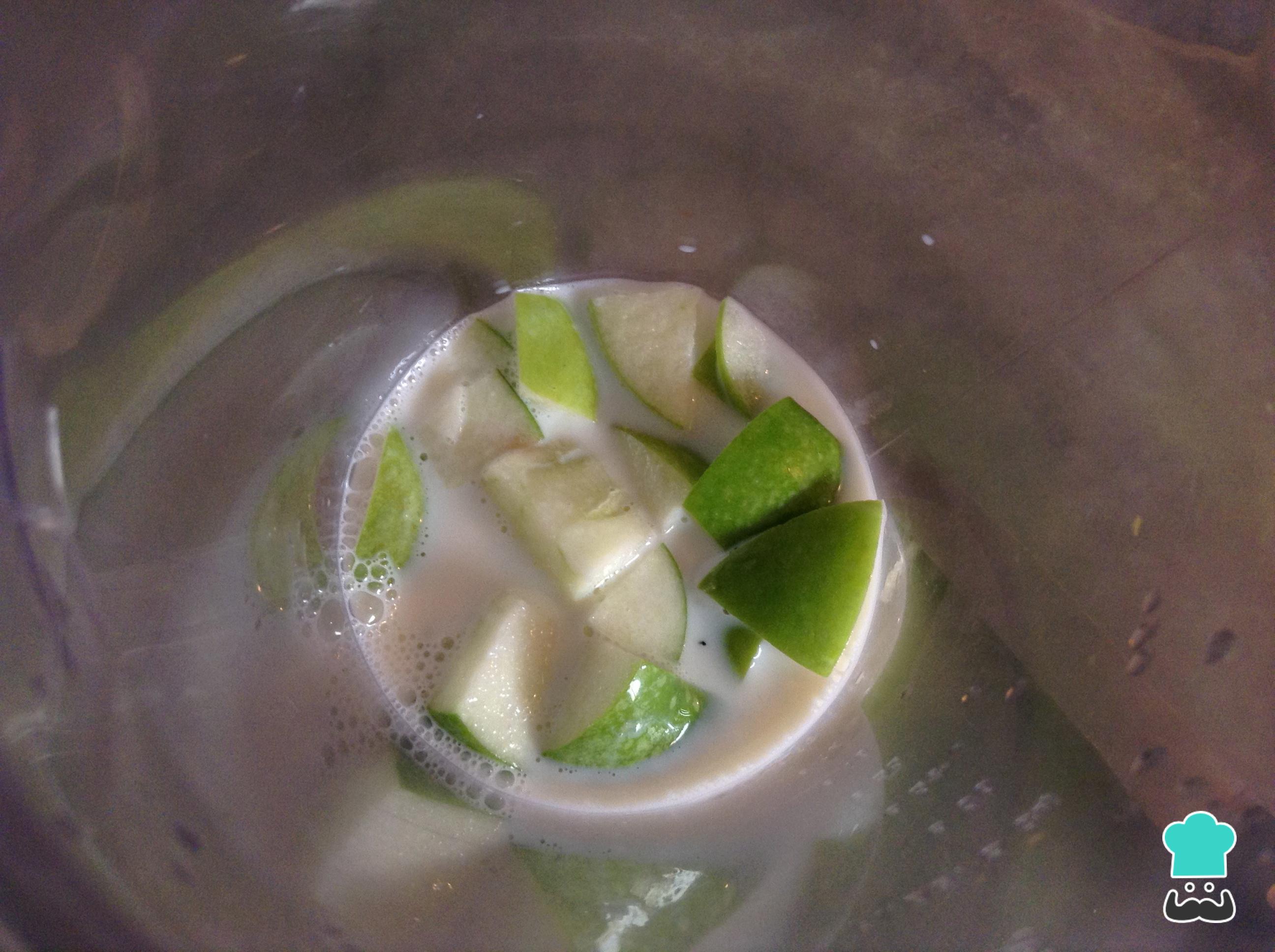 Coloque no liquidificador o leite e a maçã cortada em pedaços. Triture muito bem.