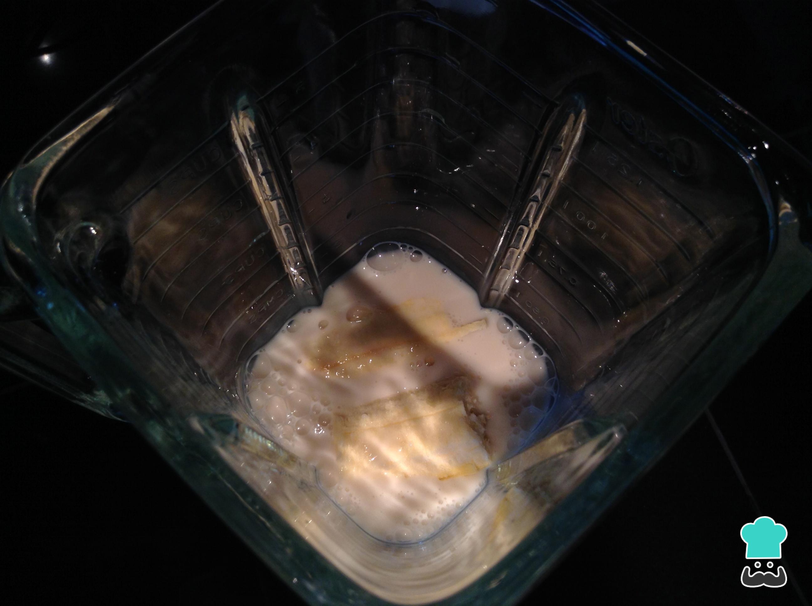 Coloque no copo do liquidificador as bananas e o leite de amêndoa. Bata muito bem.