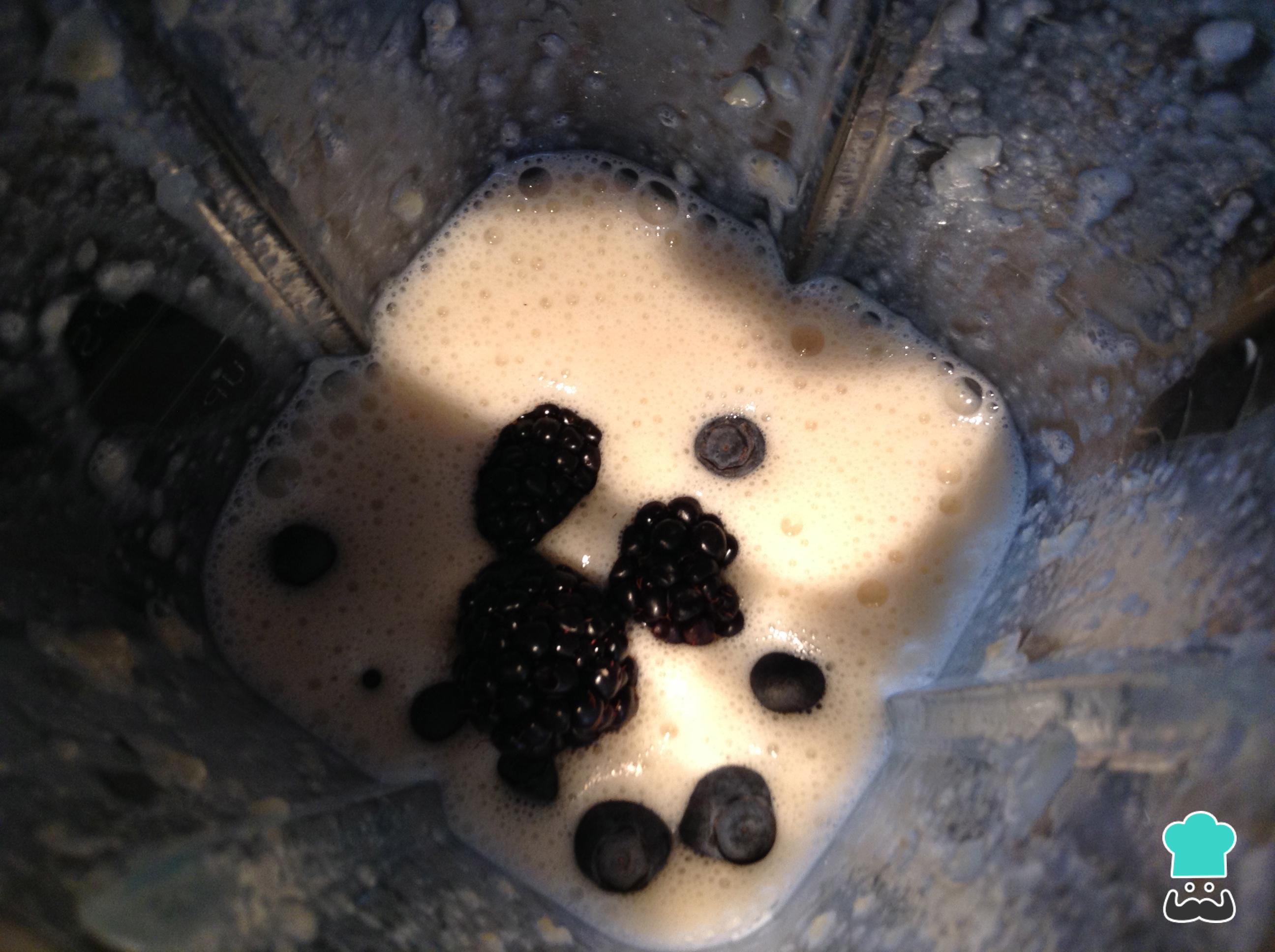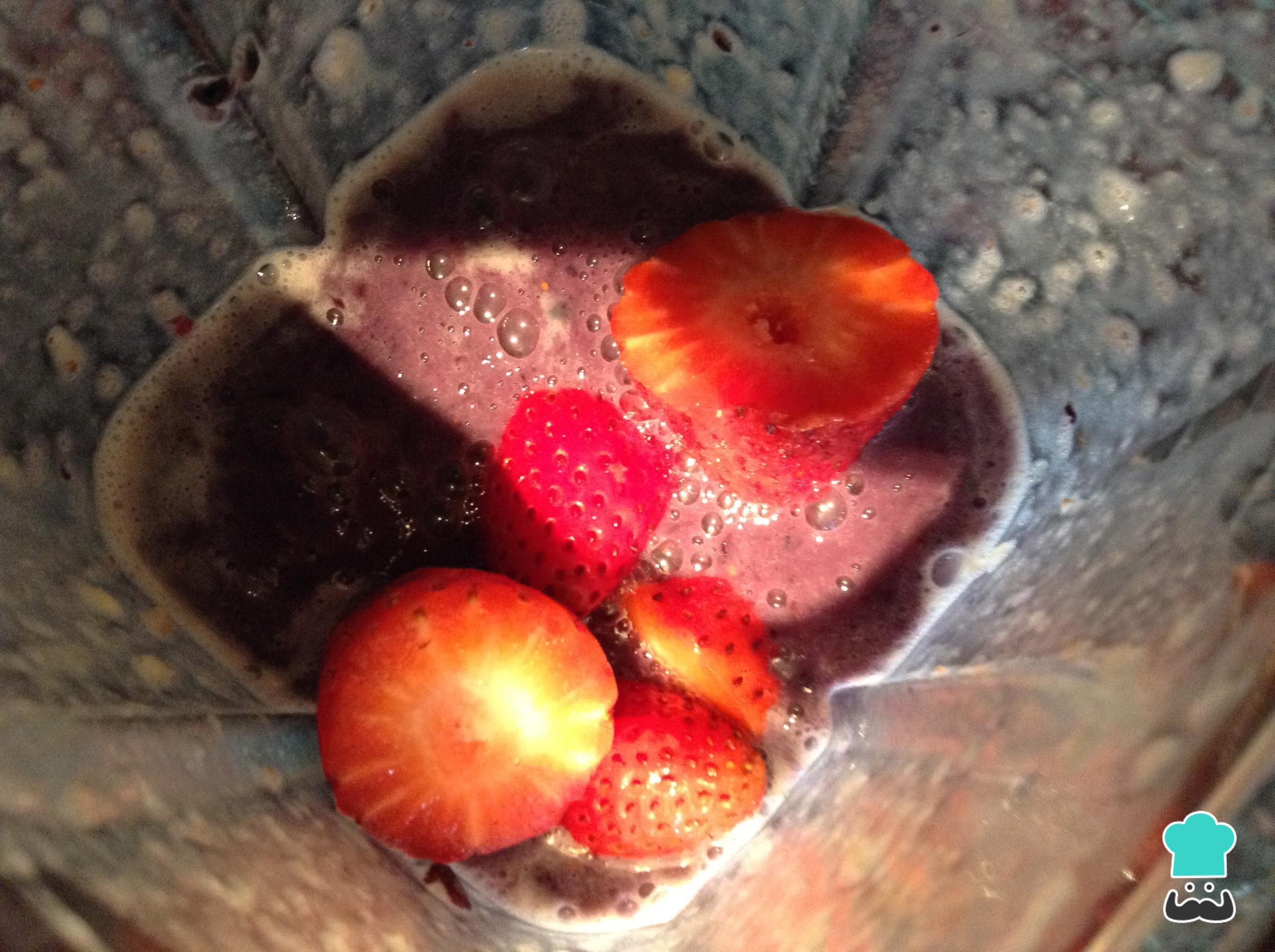 Acrescente os morangos e bata. Se quiser neste momento pode adicionar açúcar ou algum doutro adoçante a seu gosto.