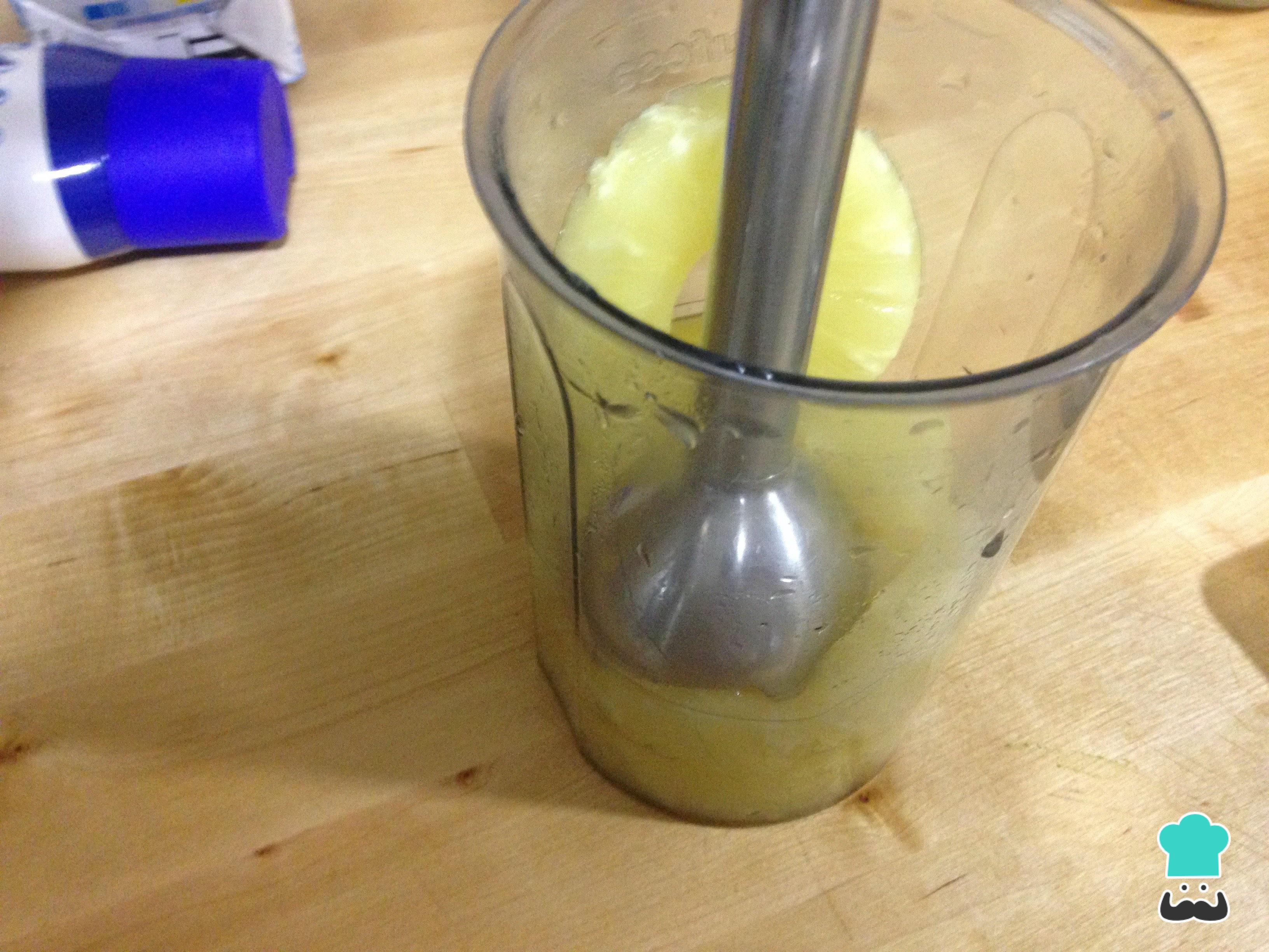 Antes de mais, bata o abacaxi no liquidificador ou com um mixer, de forma a obter uma polpa. Reserve a calda.