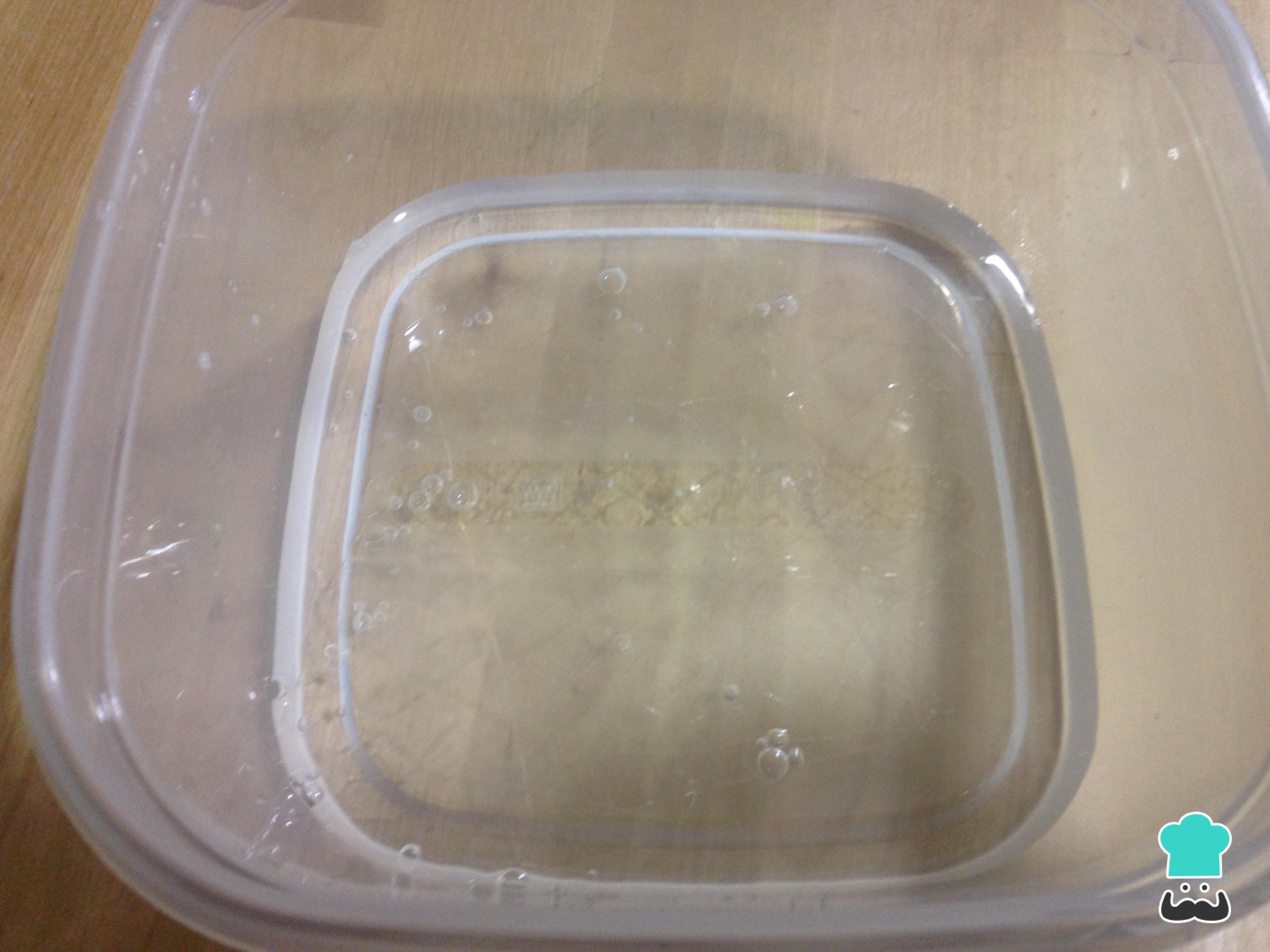 Para amolecer as folhas de gelatina, coloque-as em uma tigela com um pouco de água fria.