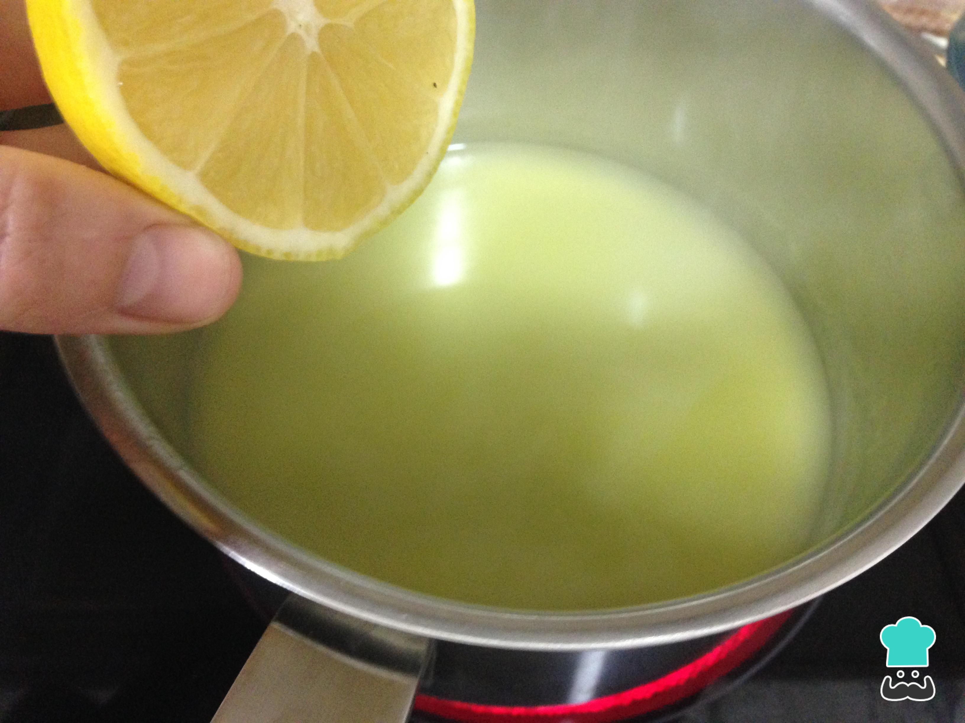 O passo seguinte desta sobremesa francesa é colocar numa panela a calda do abacaxi e o suco de limão. Leve ao fogo para esquentar, e retire antes de ferver. Adicione as folhas de gelatina escorridas, misture muito bem para dissolver, e deixe esfriar.