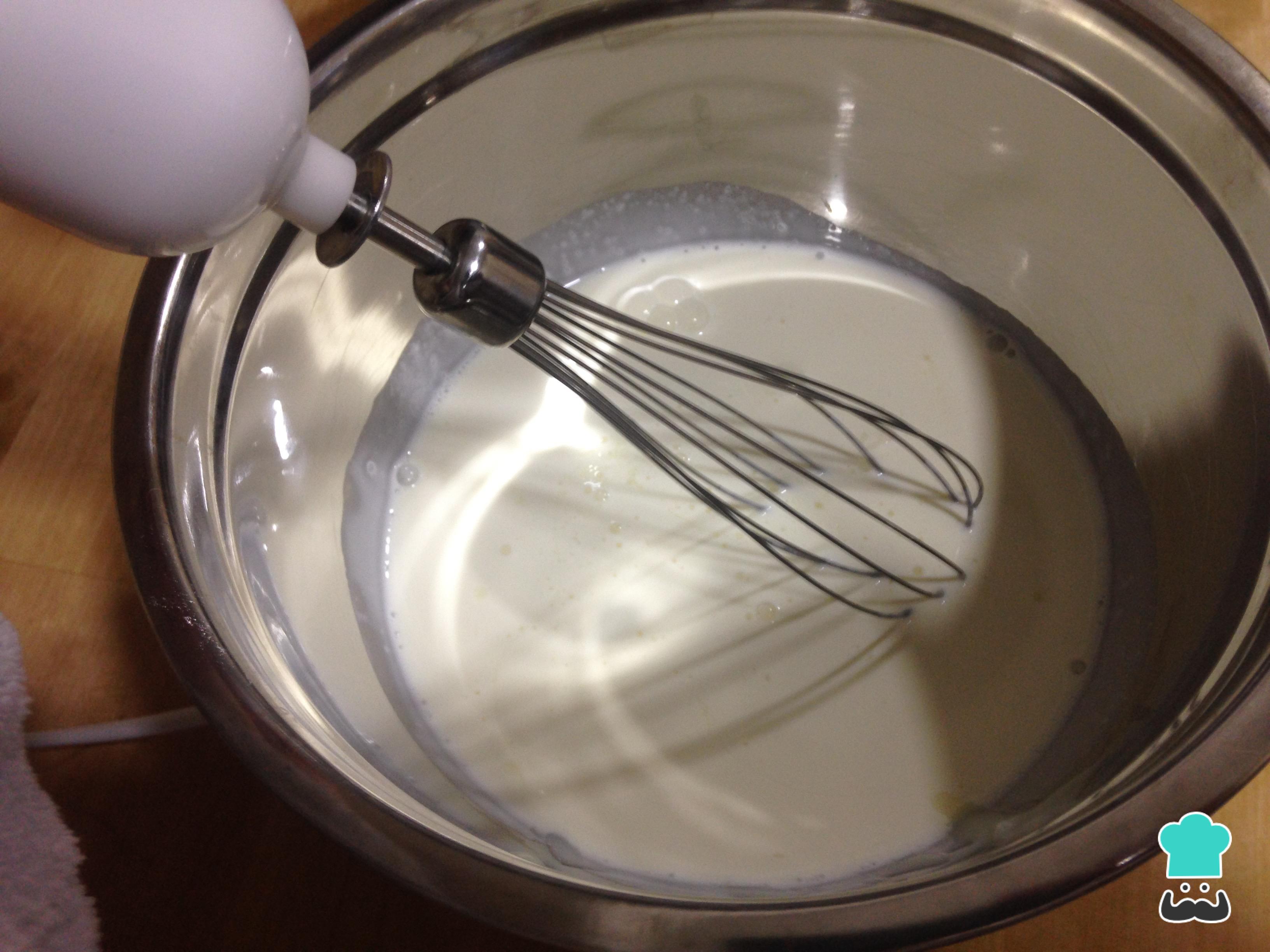 Numa tigela à parte, bata o creme de leite com o leite condensado e o açúcar, de preferência usando uma batedeira elétrica.