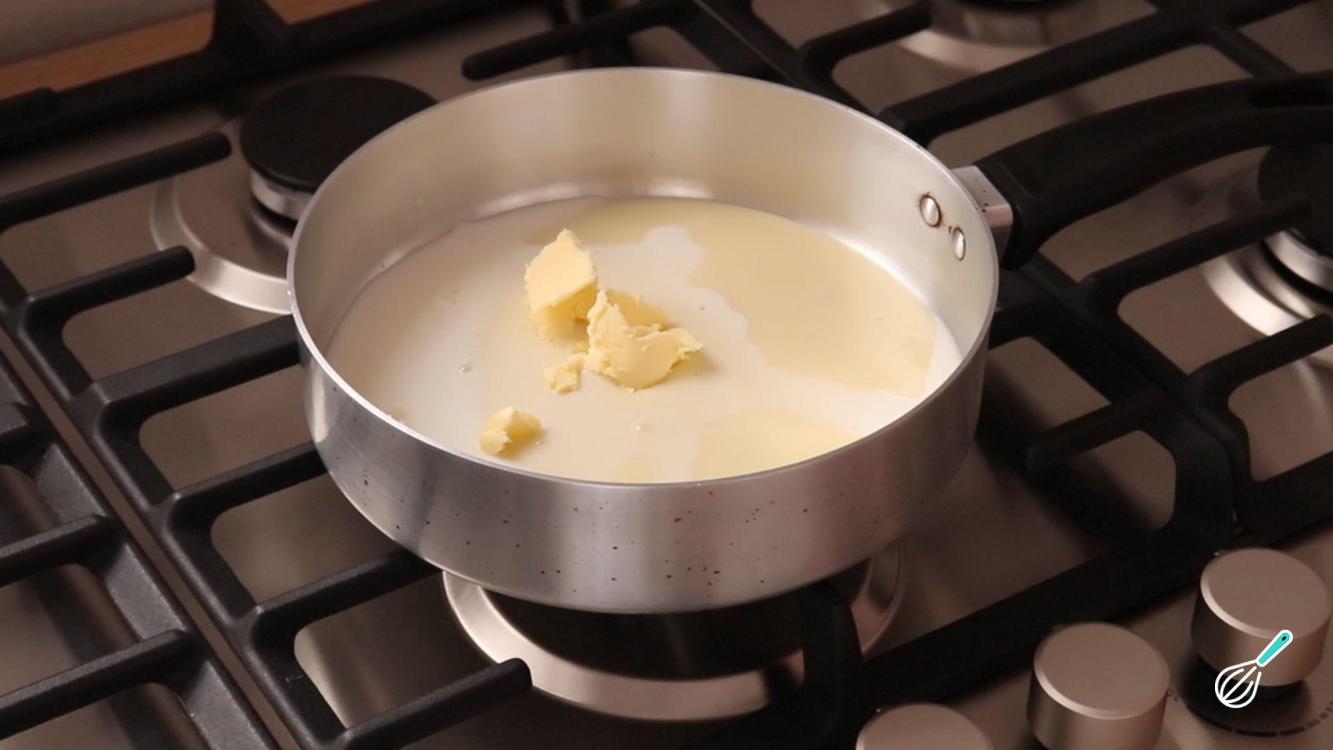 Coloque o leite condensado, o leite e a manteiga numa panela e leve ao fogo baixo.