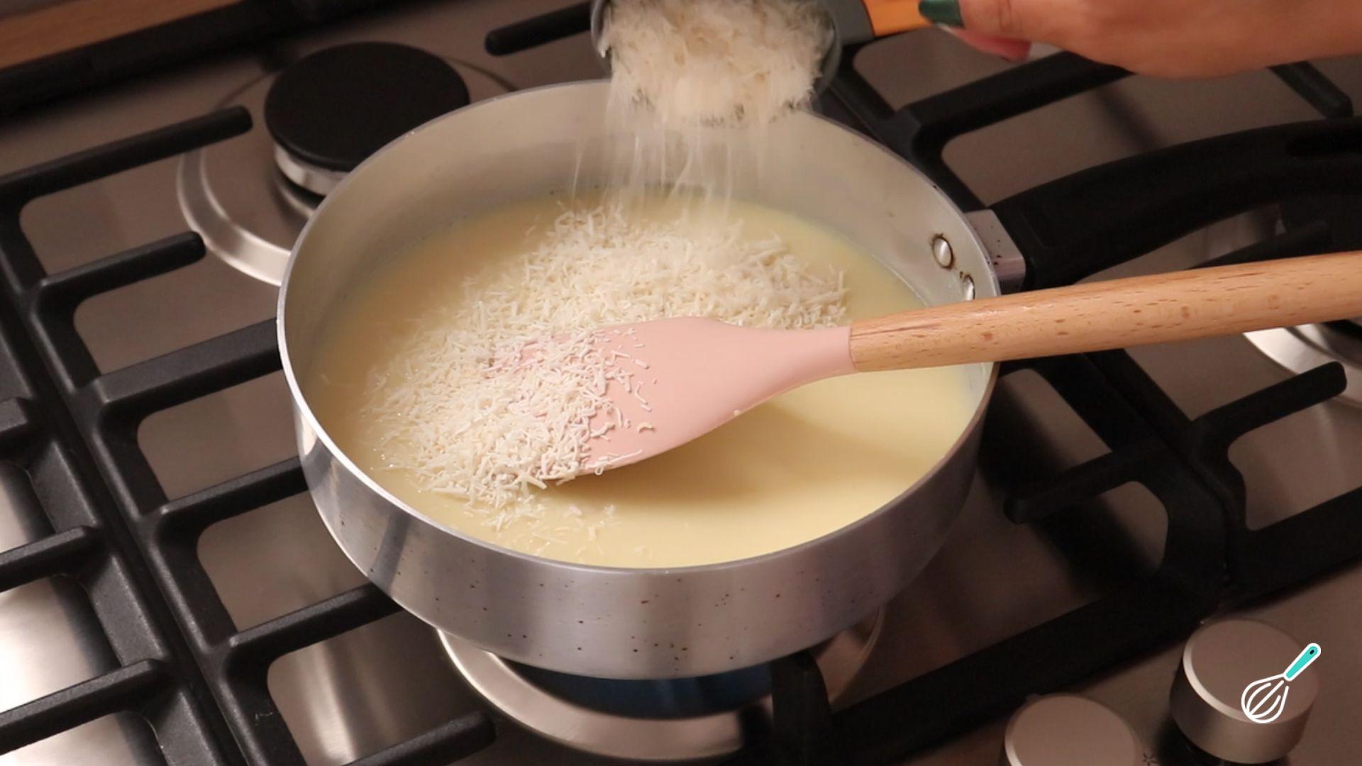 Quando a manteiga derreter, acrescente o coco ralado e continue mexendo por cerca de 12 minutos, até engrossar.
