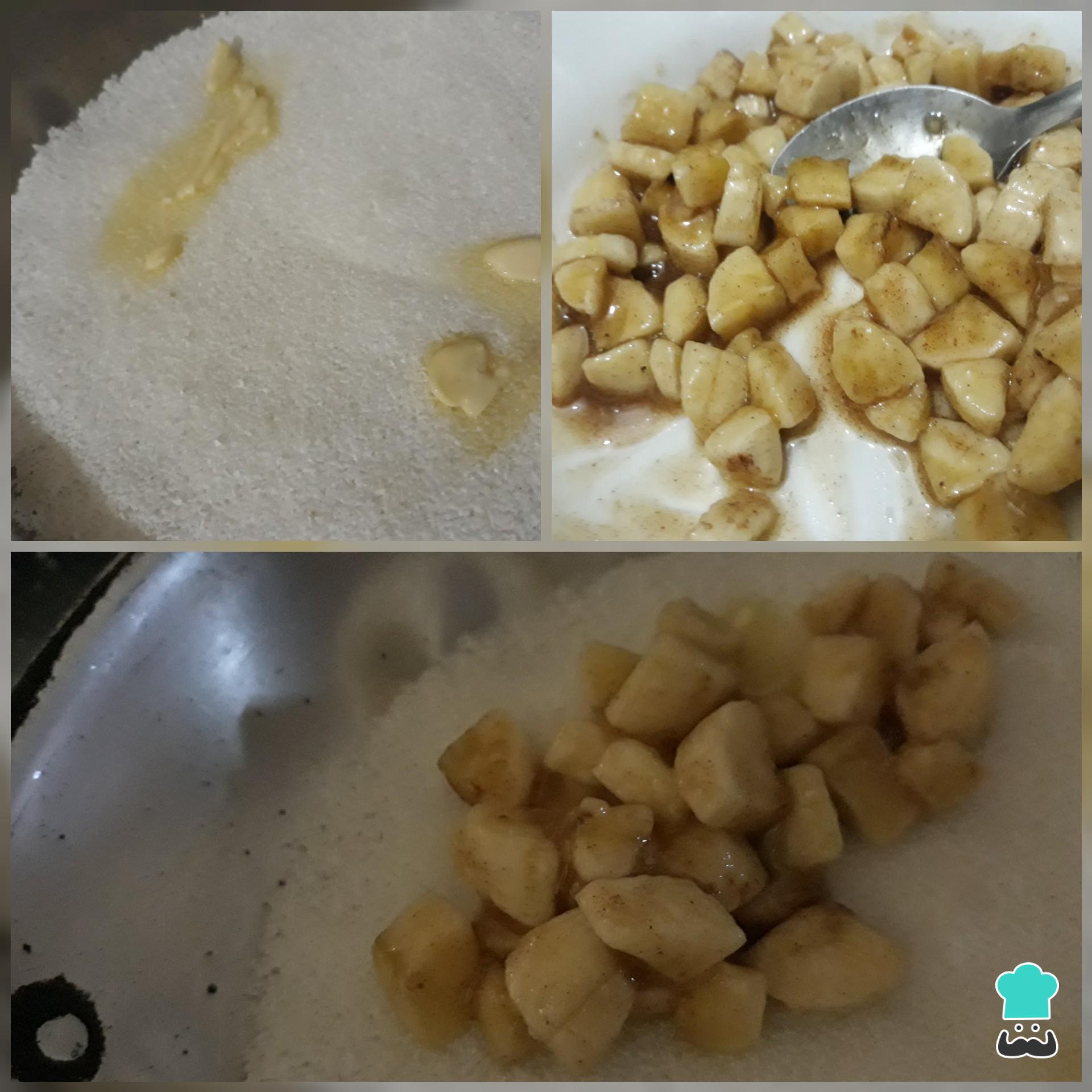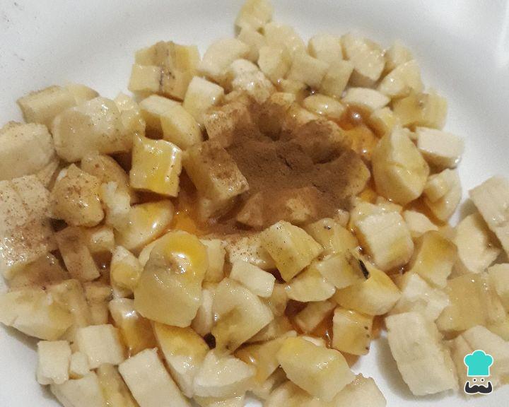 Corte as bananas em pedaços e coloque num prato. Adicione o mel e a canela, misture e reserve.