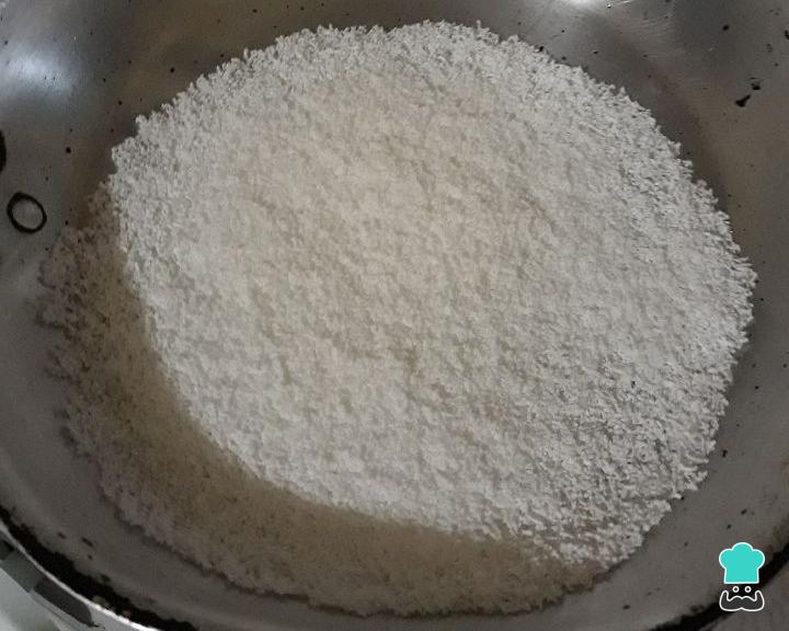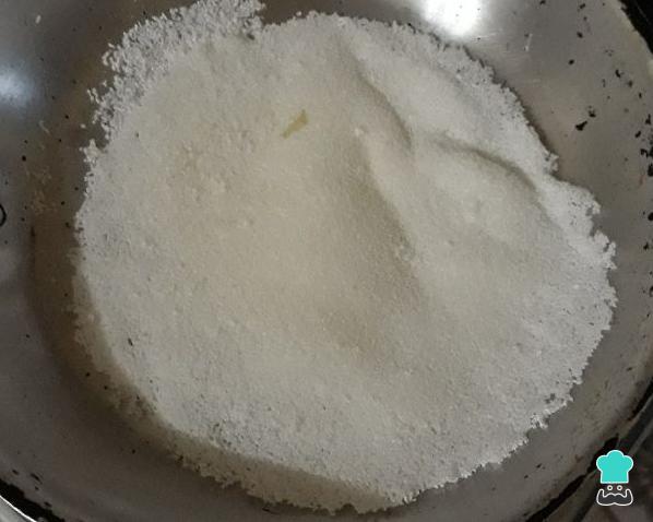 Leve ao fogo uma frigideira e, quando ela estiver aquecida, peneire o beiju de tapioca até cobrir o fundo da frigideira.