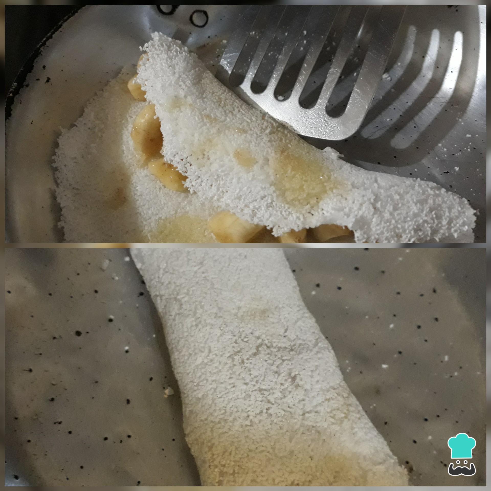 Espalhe sobre a massa um pouco de margarina e a mistura de banana, mel e canela, que é o recheio deste beiju de tapioca doce.