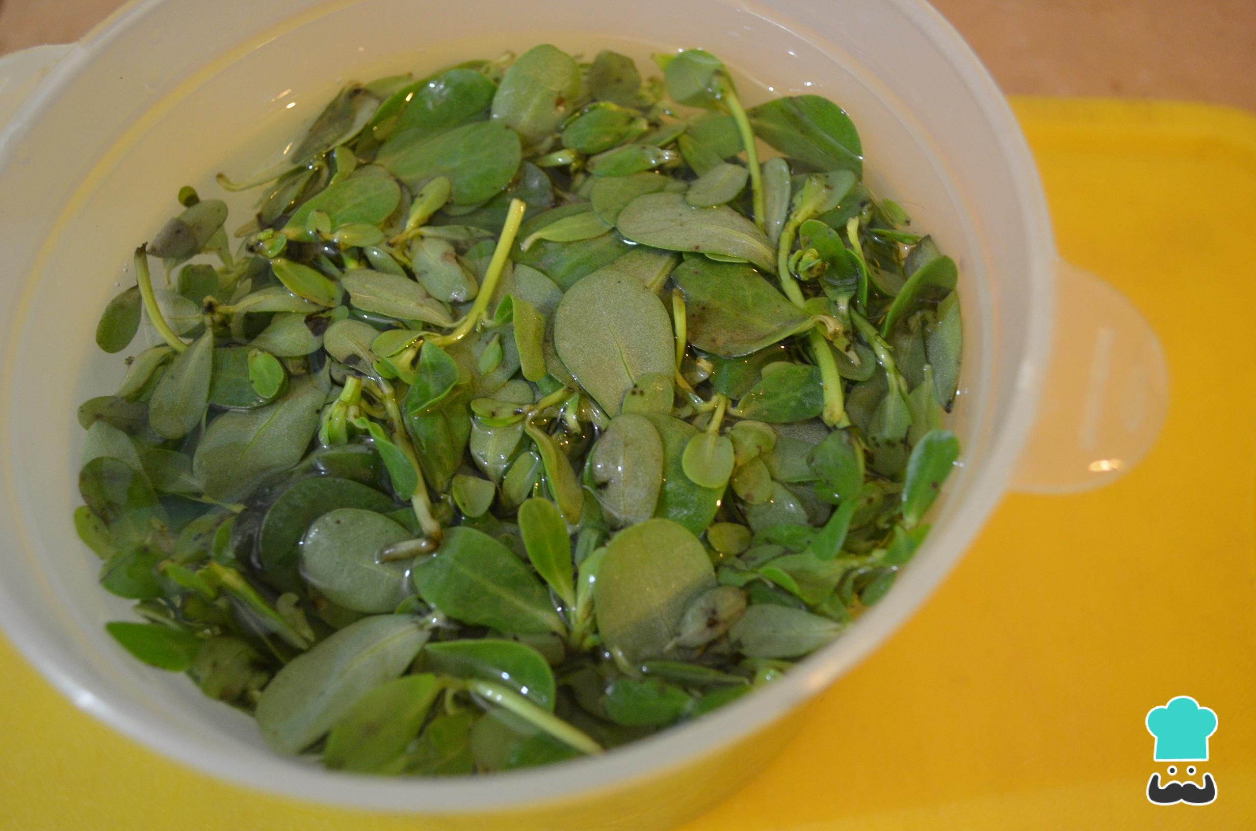 Para preparar a beldroega com ovo, comece por lavar e desinfectar bem as folhas. Separe as folhas dos ramos mais grossos e reserve. Enquanto isso, coloque meio litro de água aquecendo em uma panela.