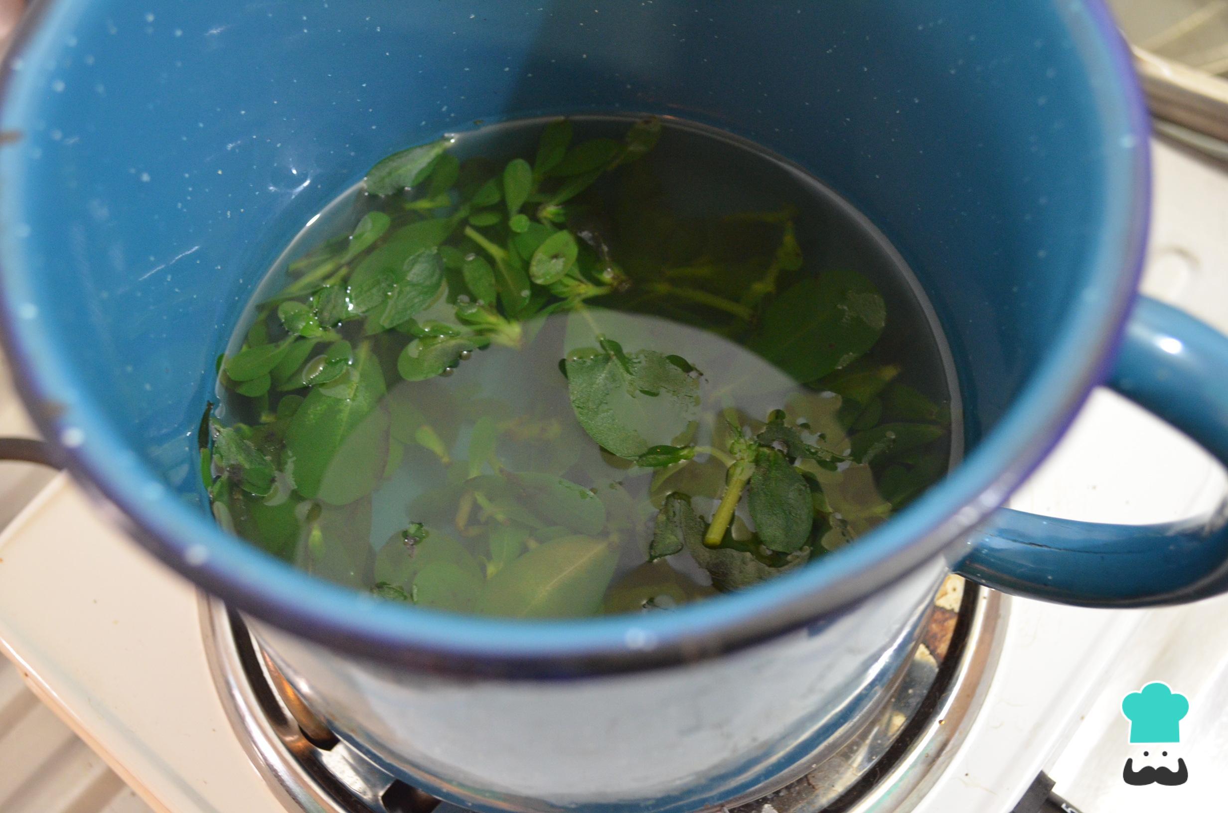 Uma vez que a água esteja fervendo, cozinhe as folhas de beldroega por 3 a 4 minutos. Logo de seguida, retire a beldroega da água, esprema um pouco e reserve.