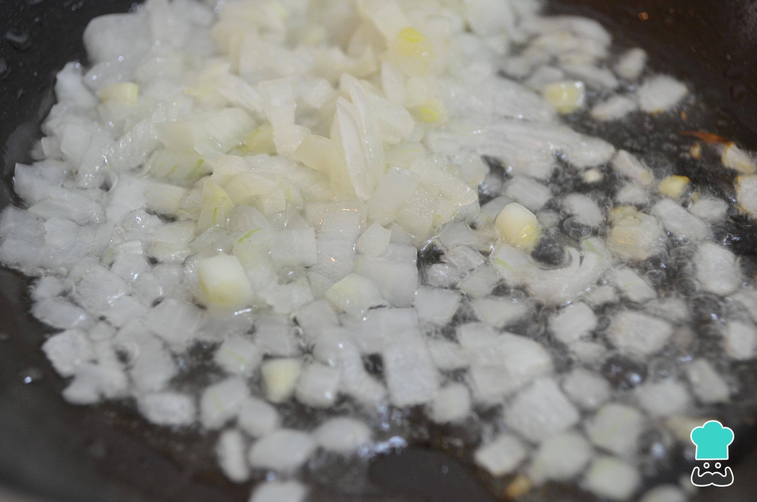 Pique finamente a cebola e refogue em uma panela já quente com duas colheres de sopa de azeite de oliva.