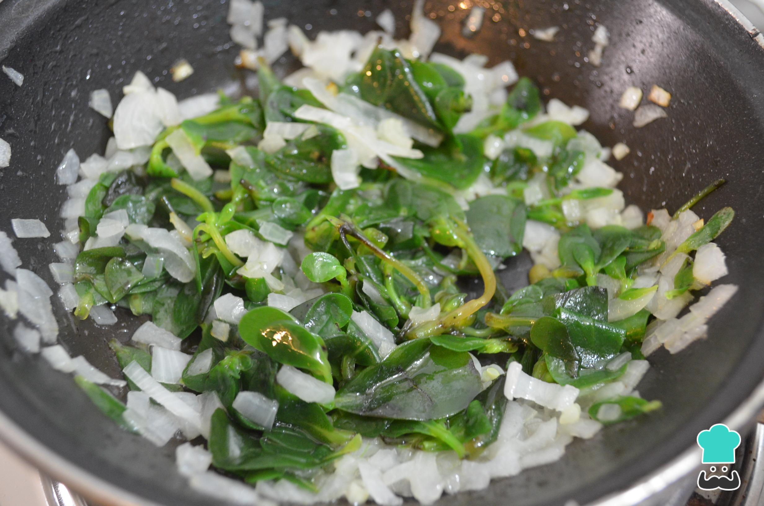 Adicione a beldroega cozida e misture com a cebola. Cozinhe, mexendo sempre, por mais dois minutos.