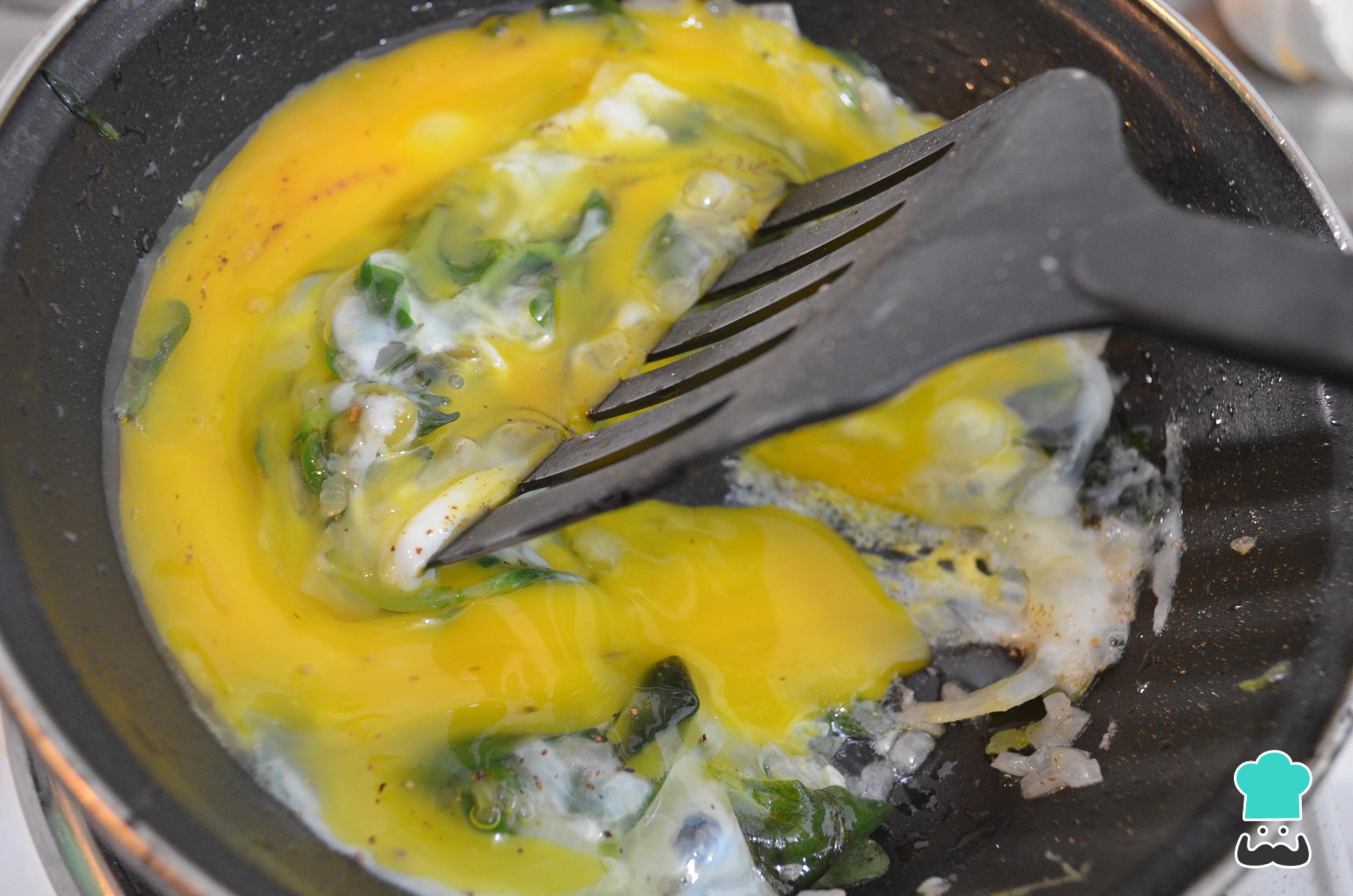 Junte os ovos, misture bem com a verdura e tempere com sal e pimenta do reino a gosto.