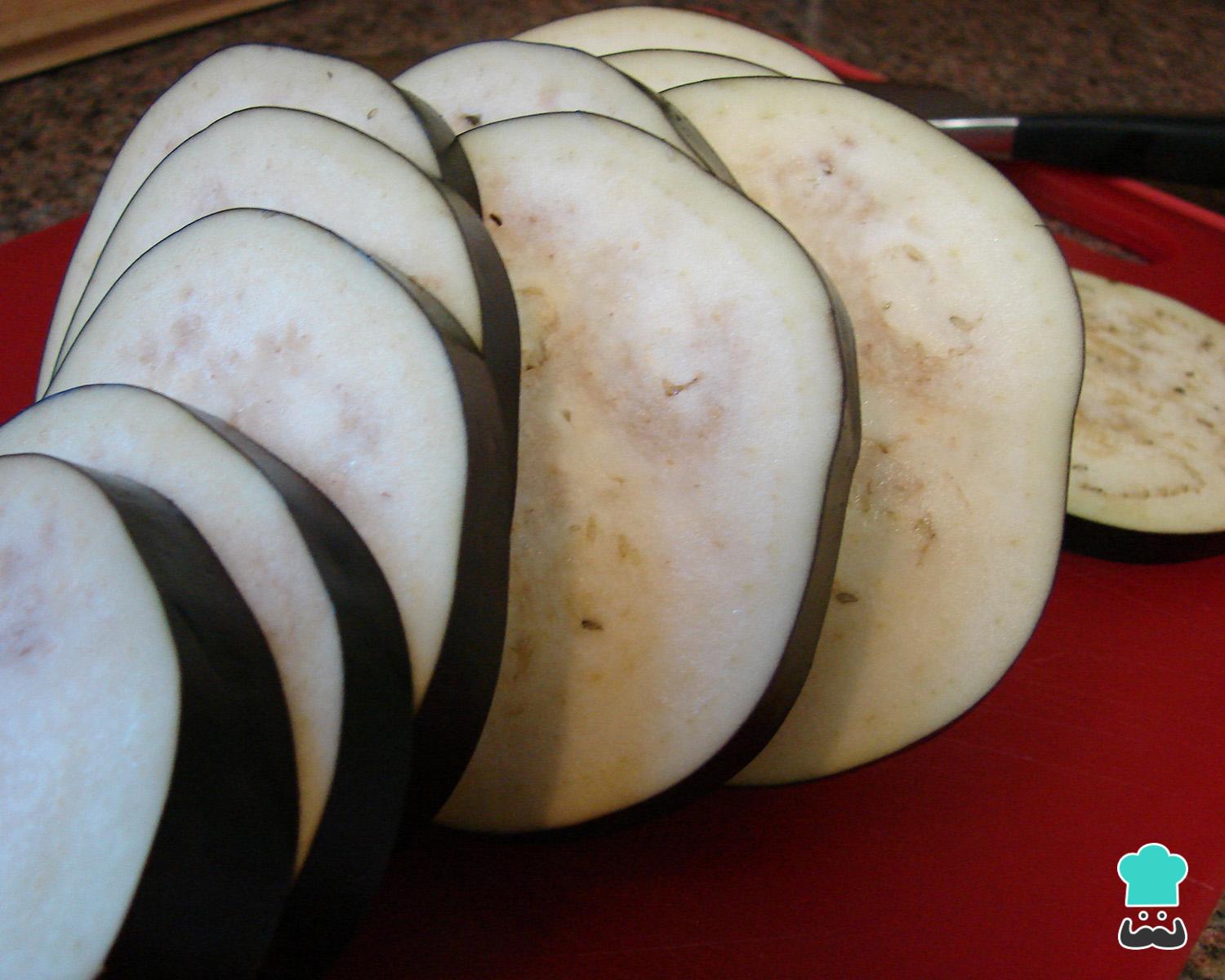 Comece por lavar a berinjela e cortar em rodelas com 1 cm de espessura ou um pouco menos. Coloque em uma bacia com água e sal e reserve por 15 minutos, para eliminar o amargor.