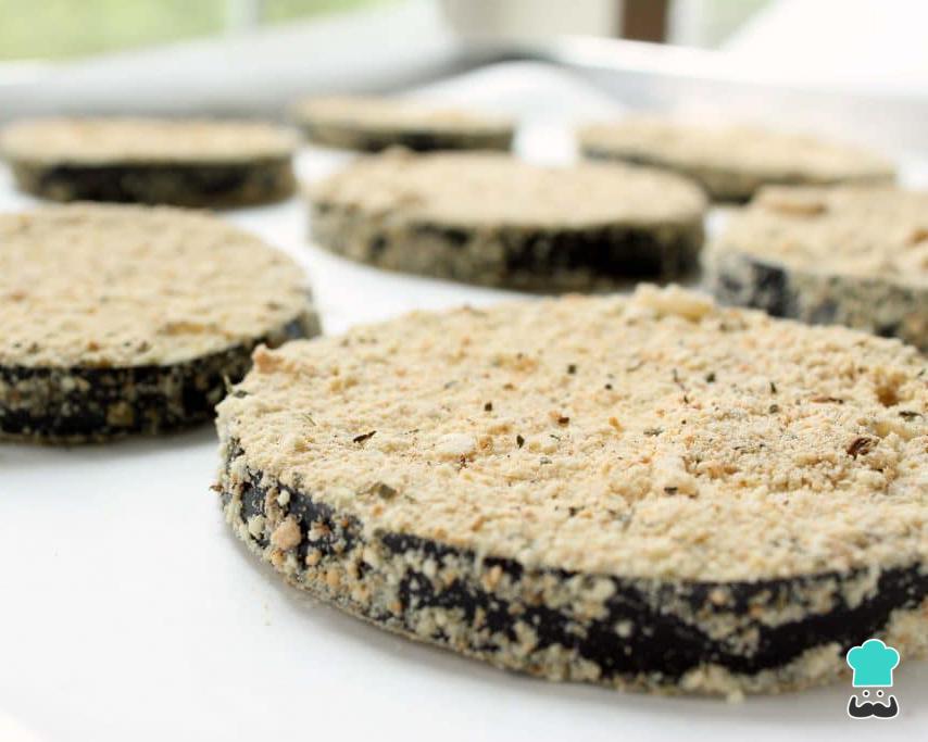 Dica: Pressione ligeiramente o trigo/aveia e a farinha de rosca/fubá na berinjela para grudar bem. Se você quiser, pode misturar oréganos ou tomilho na farinha de rosca.