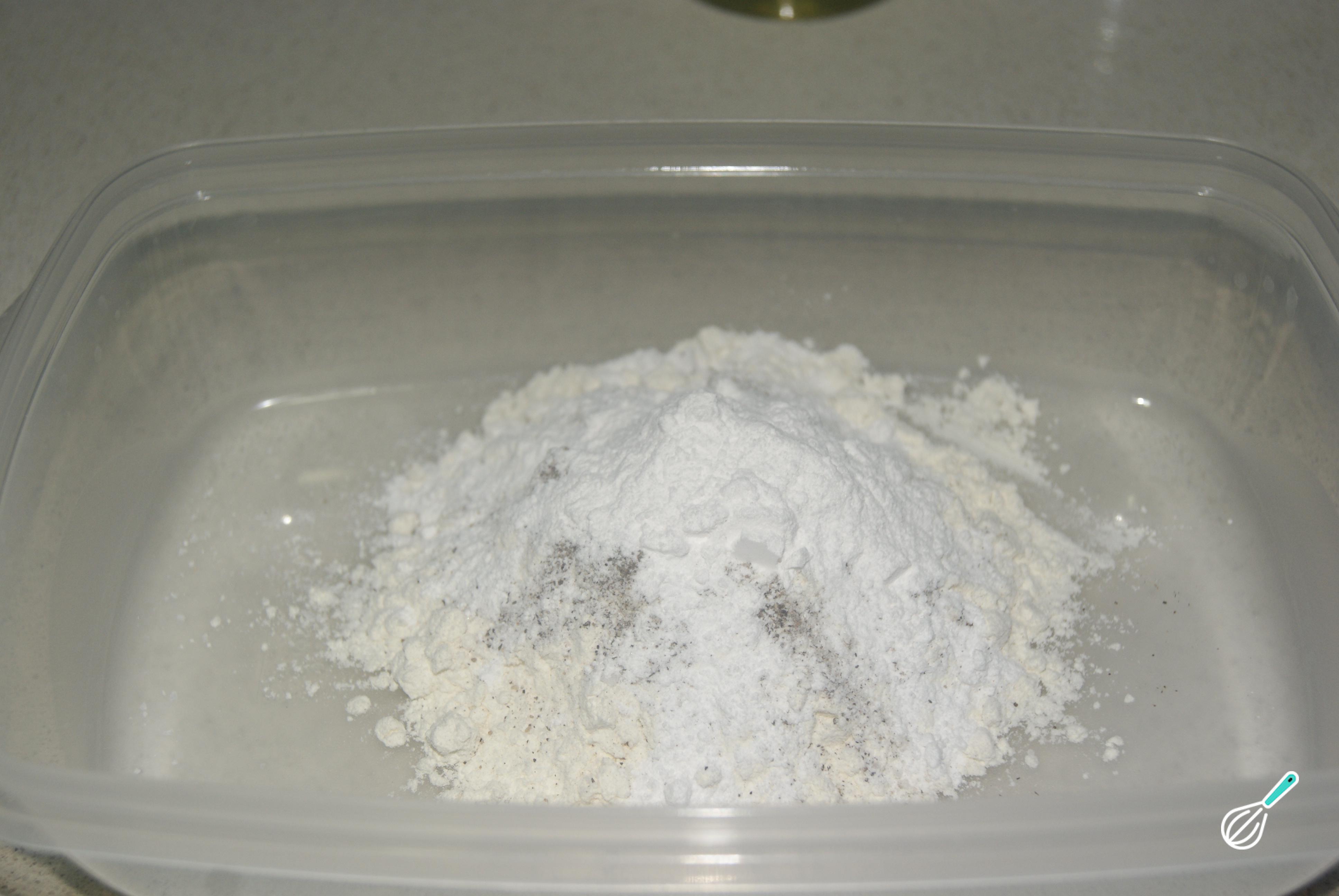 Prepare a massa misturando a farinha, o sal, a pimenta do reino e o fermento.